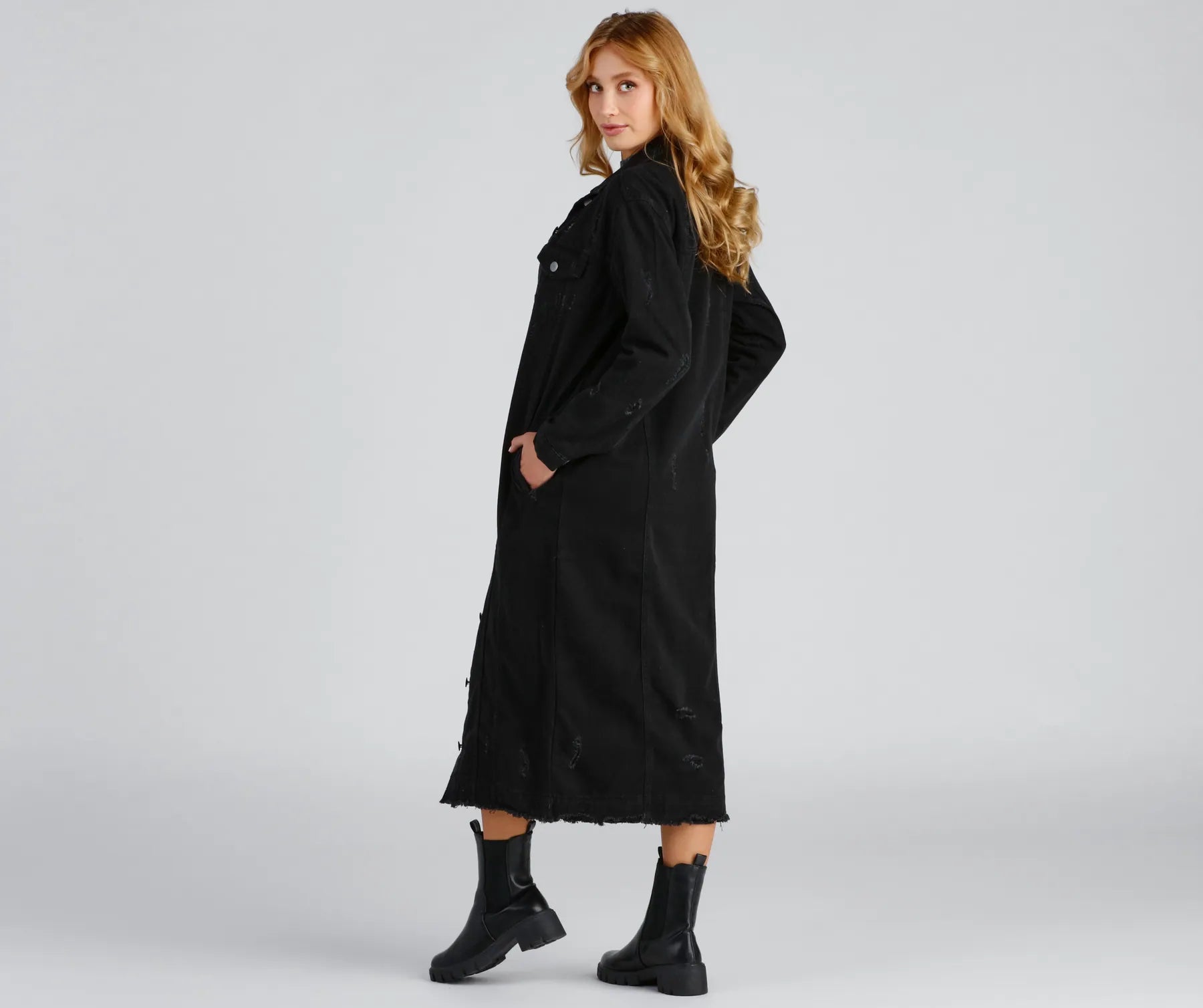 Layer on the effortless and edgy vibes with this denim jacket! It features a collared neckline, long sleeves, a button-down front, distressed detailing, and a long line relaxed fit. Style this jacket over your fave casual dress and complete the look with combat boots.
