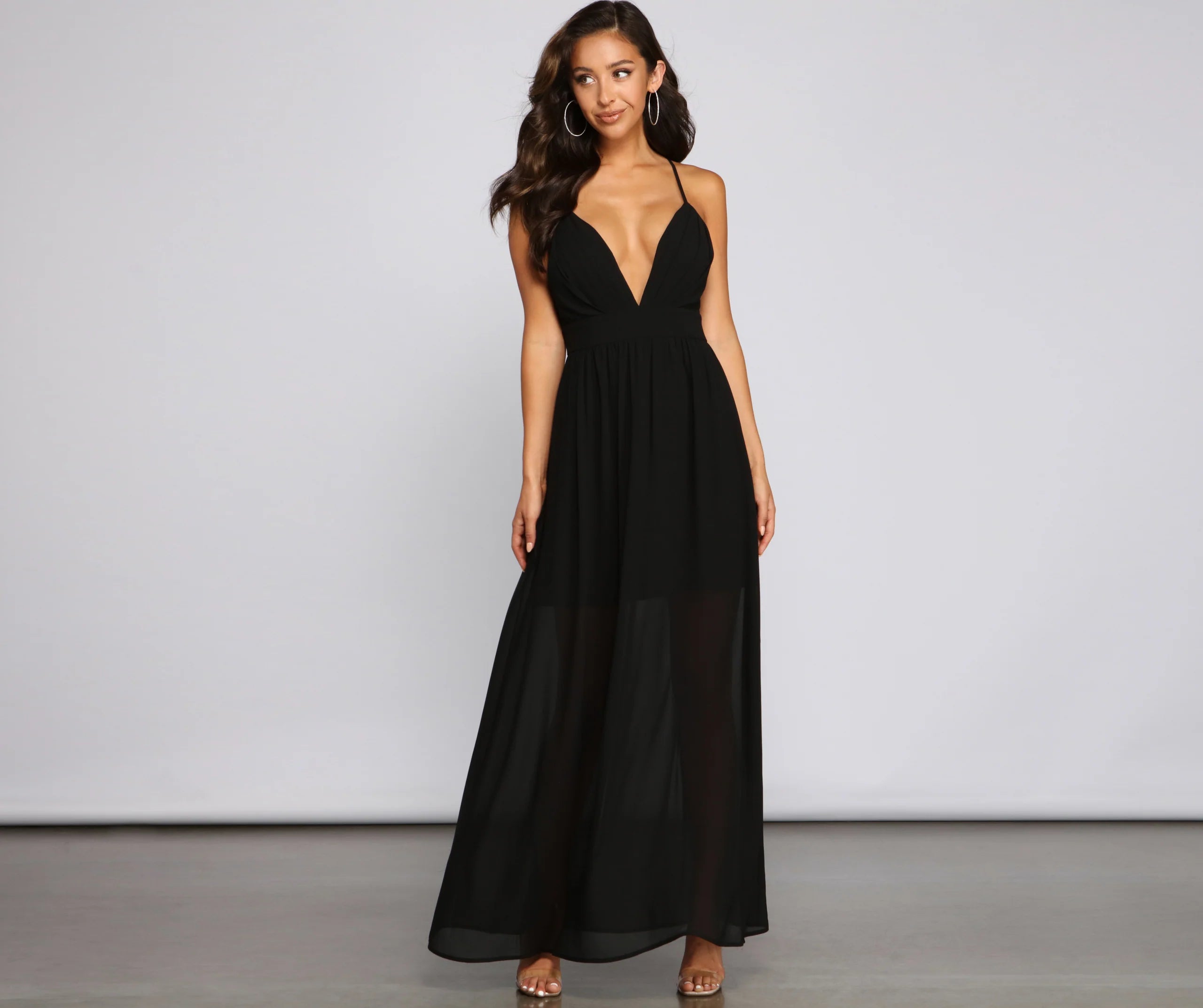Keep it effortless in a maxi dress that is perf for your next brunch or date night! The dress features a sleeveless V-neckline, adjustable spaghetti straps that cross at the back, and a maxi-length silhouette. The dress is composed of a partially lined chiffon fabric that offers a relaxed fit with minimal stretch. Complete look with sandals and rhinestone studs.
