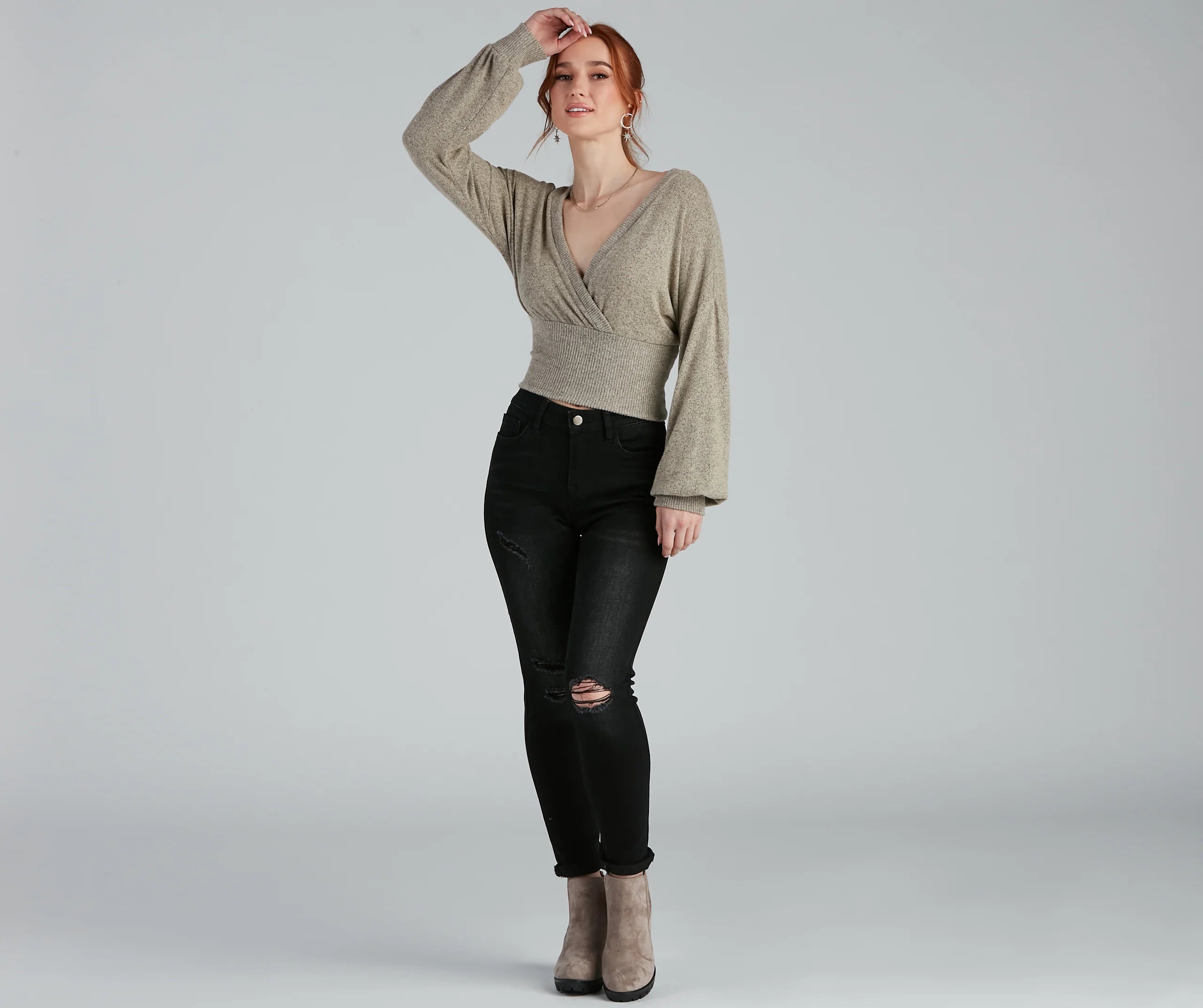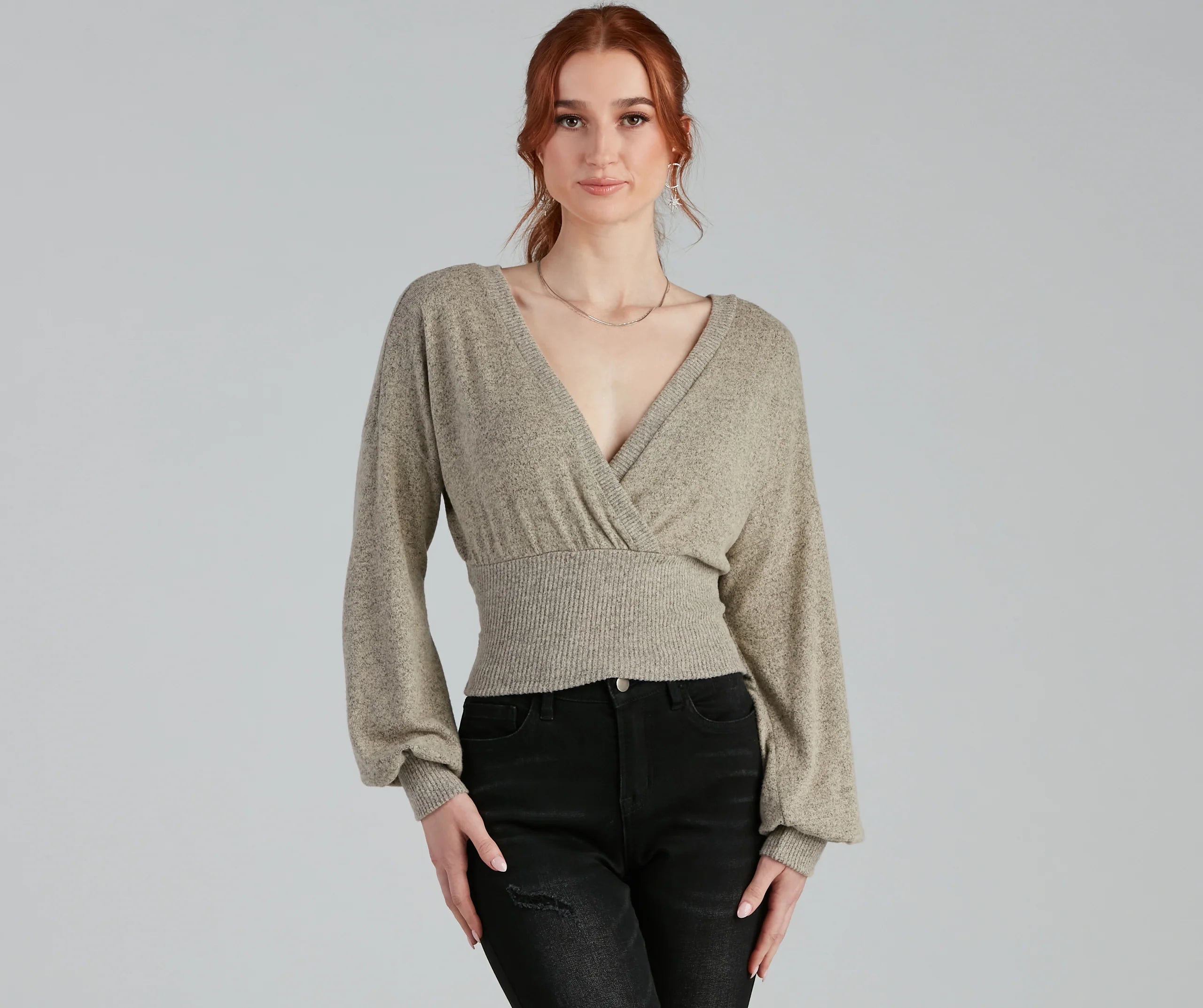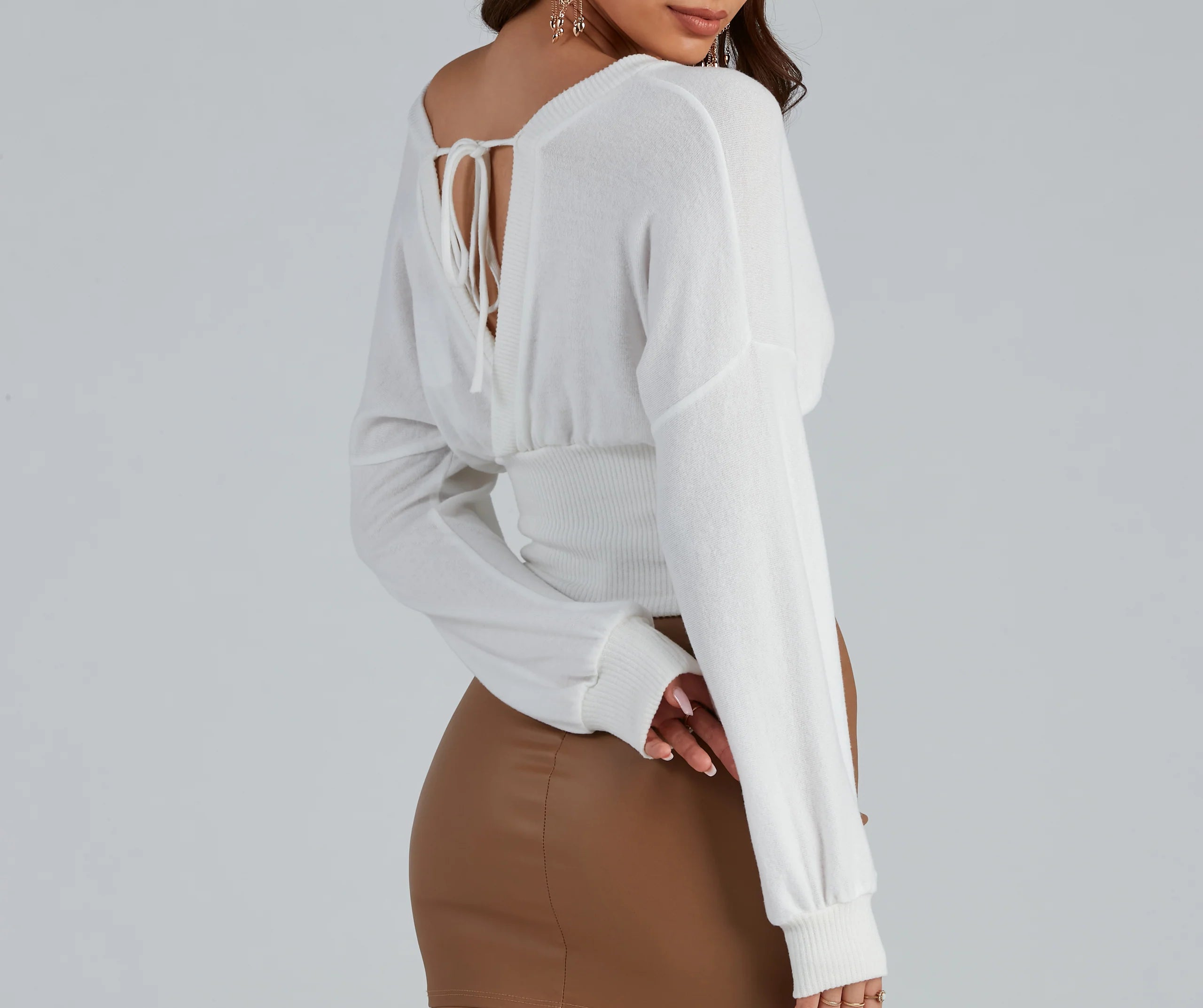 Channel effortless perfection with a sweater that nails your look! The sweater features a wrap V-neckline, long sleeves, a tie-back accent at the back, and a banded hem. The top is composed of a soft-to-the-touch knit fabric that offers a form hugging fit with slight stretch. Complete look with high waist jeans and boots.