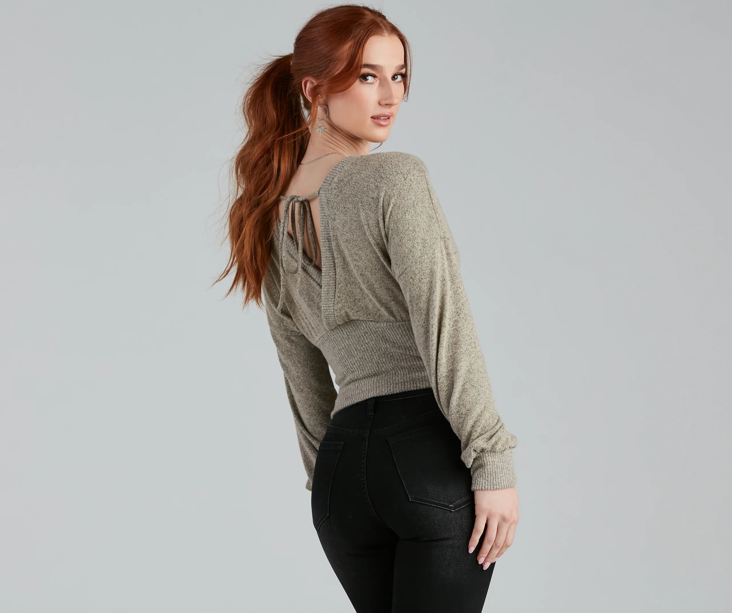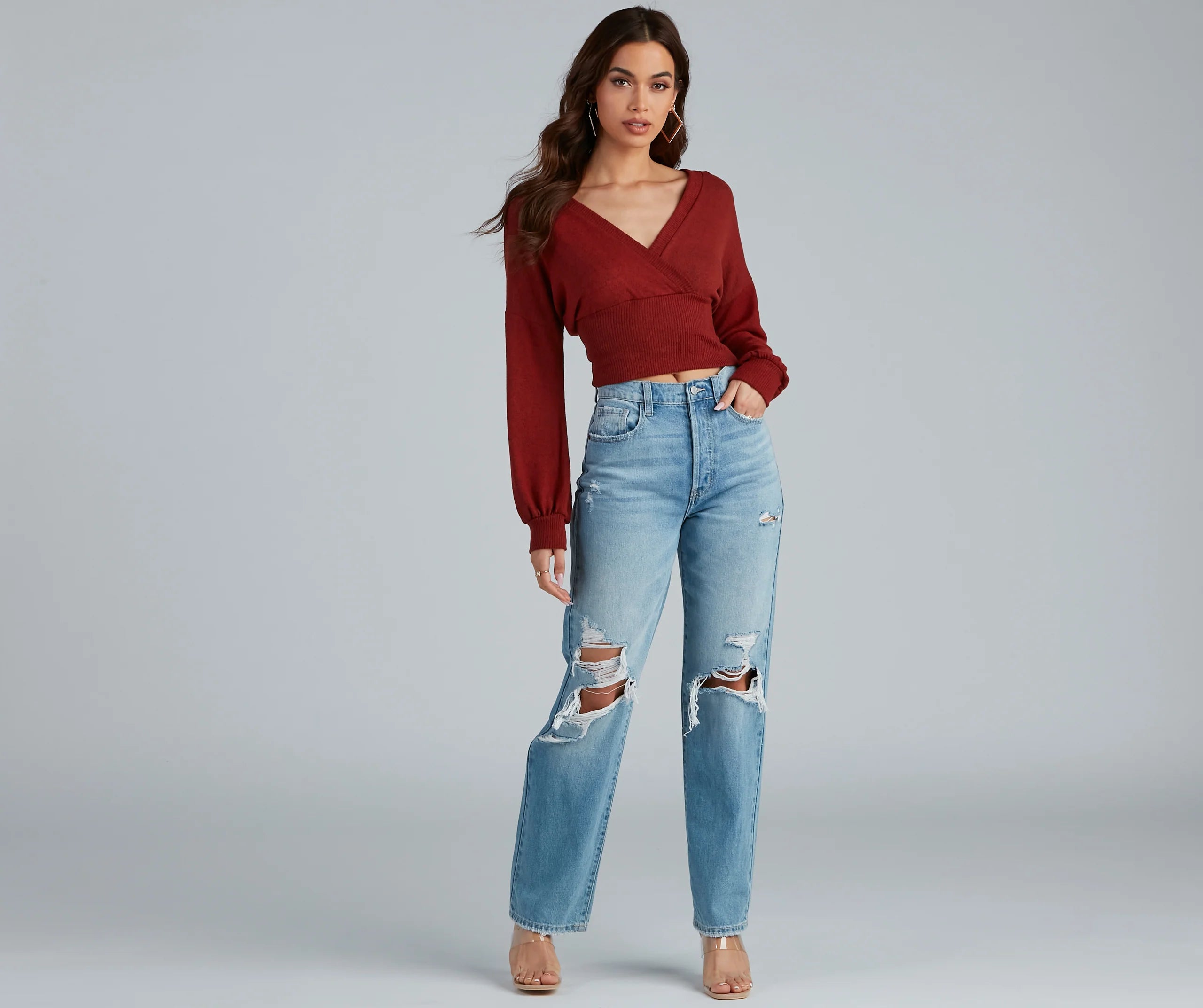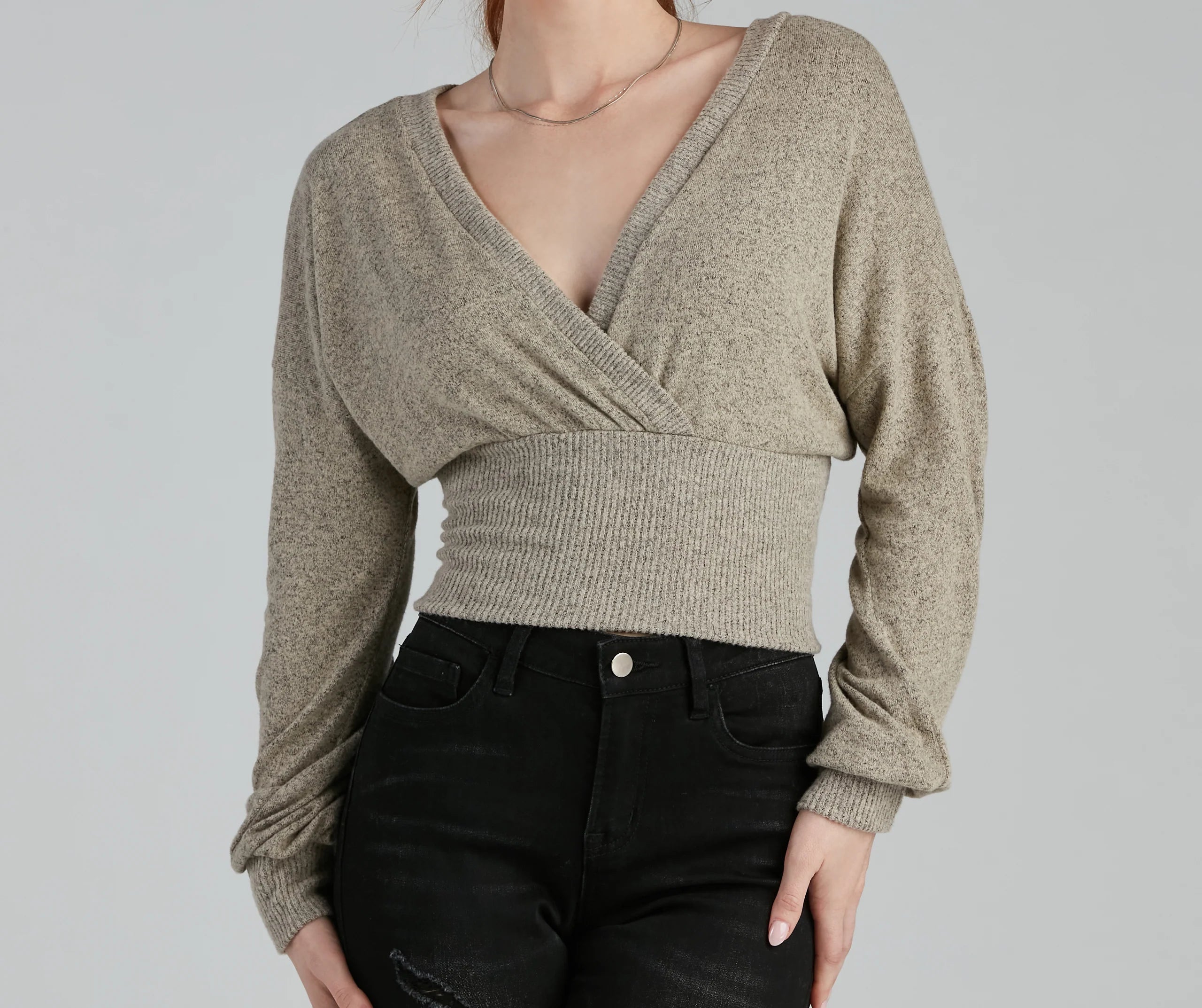 Channel effortless perfection with a sweater that nails your look! The sweater features a wrap V-neckline, long sleeves, a tie-back accent at the back, and a banded hem. The top is composed of a soft-to-the-touch knit fabric that offers a form hugging fit with slight stretch. Complete look with high waist jeans and boots.