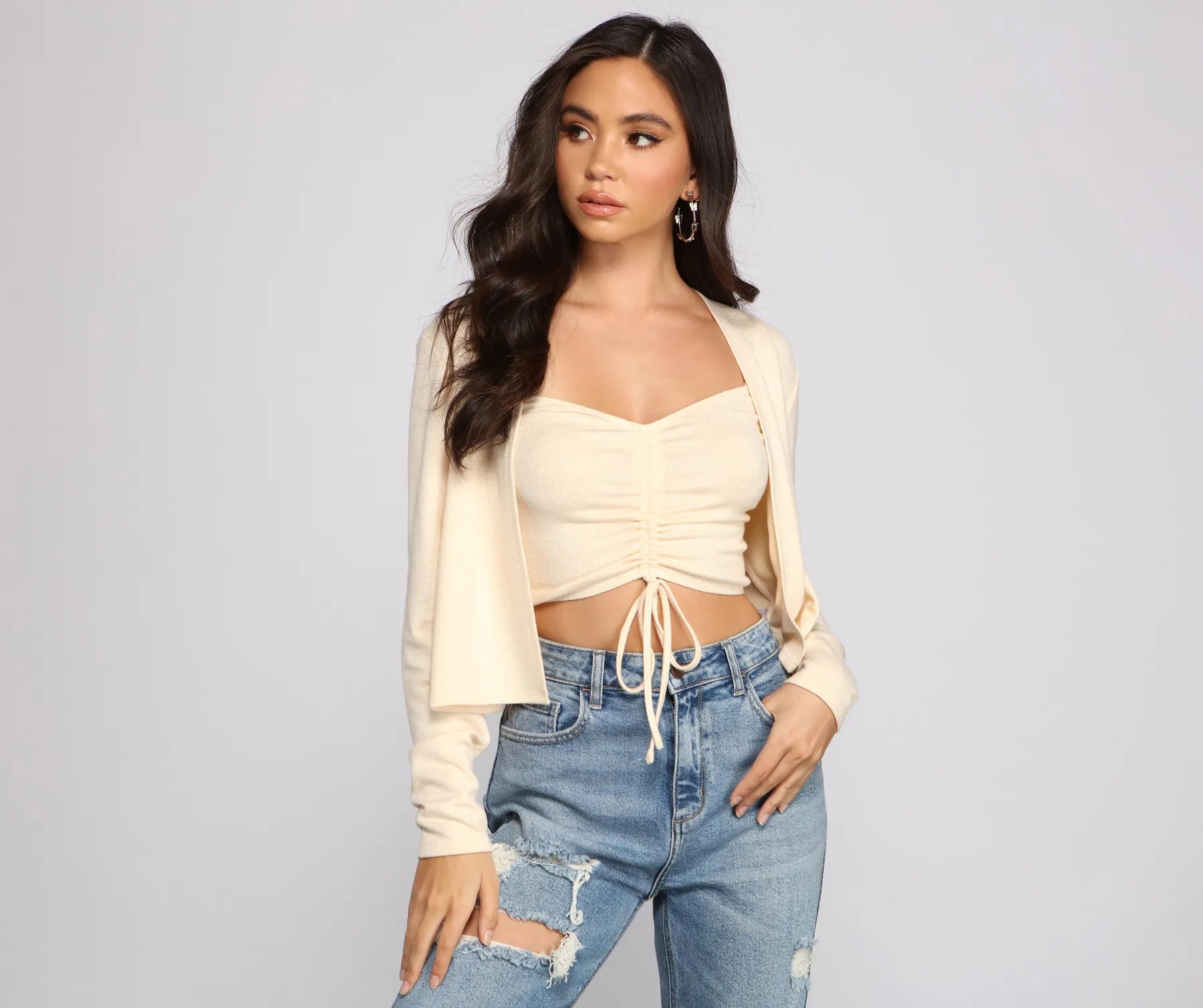 Effortlessly elevate your basic look with this lightweight knit cardigan. It features long fitted sleeves, an open front, and a relaxed fit. Pair this cardigan with the matching crop top and mom jeans for a chic vibe.