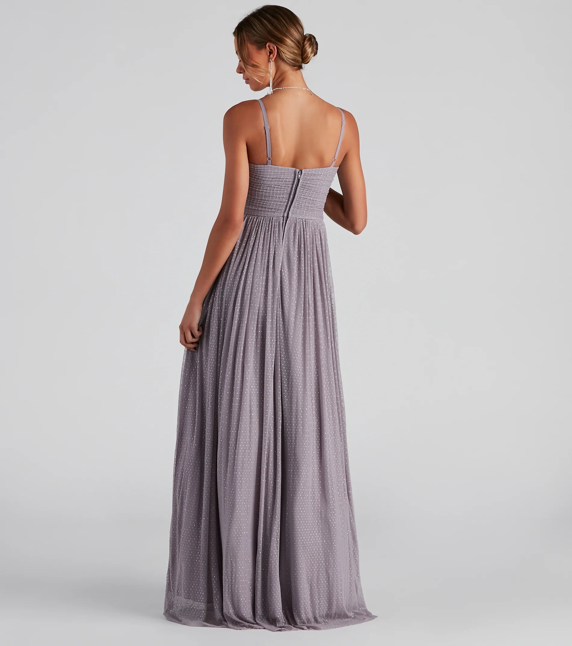 Like a breath of fresh air, the Eileen formal prom dress offers simplicity with femme allure to captivate every room she enters. Look and feel so elegant in her sleeveless V-neck, built-in padded bust, adjustable spaghetti straps, and a fitted empire waist with back pleating atop the A-line silhouette that leads to her floor-sweeping hem. She's composed of a swiss dot mesh overlay with an inner lining and a back zipper closure. Complete your look for prom with a sparkling tiara and clutch.