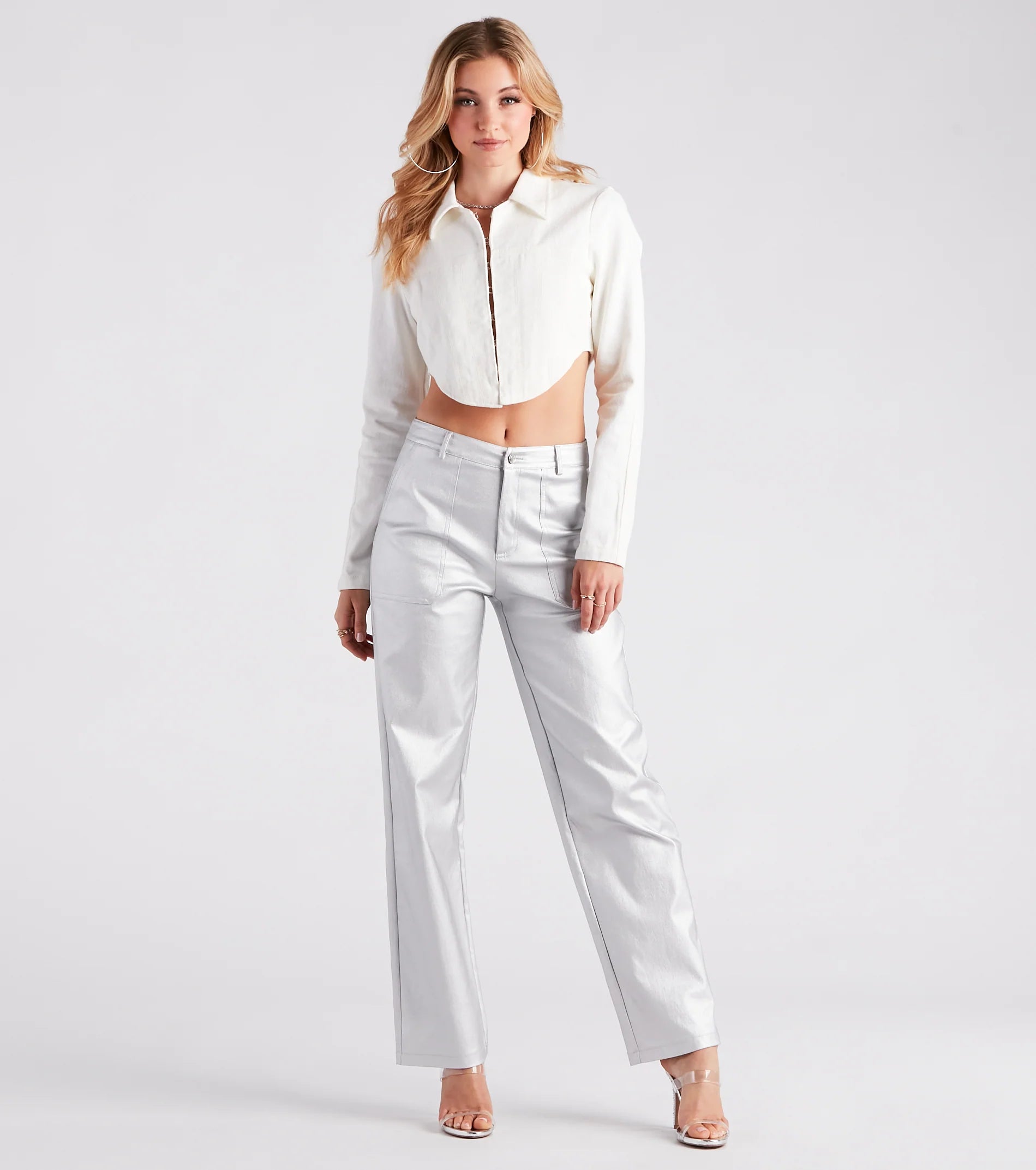 This trendy and chic cropped denim jacket will elevate your casual style! It features a collared neckline, long sleeves, a corset-designed bodice with front hook and eye closures, a curved and cropped hem, and a fitted silhouette. Pair with faux leather pants and strappy mules.