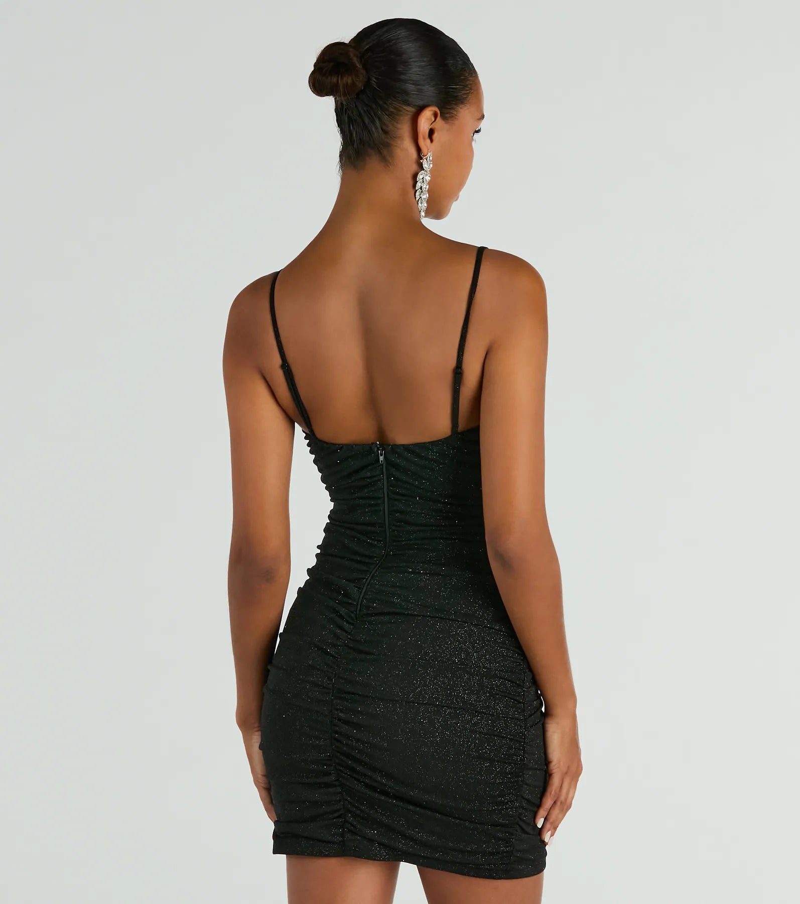 For the bride-to-be or birthday babes! The Elsa party dress will elevate your celebration. She features a sleeveless V-neckline, adjustable spaghetti straps, and side and back ruched seams that accentuate your curves along the bodycon silhouette and flirty mini-length hem. The formal dress is composed of a glitter knit fabric with a stretchy knit lining. Complete the look in sassy platform heels.