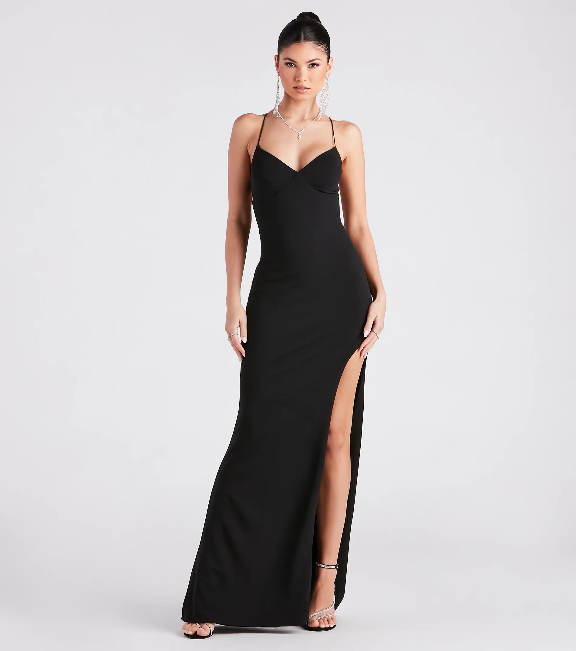 You'll be the talk of the night wearing the Esmerelda formal dress at school dances, black tie events, or banquets! She features a striking and sleeveless V-neckline, sleek bungee spaghetti straps that create the open strappy back design, and a flattering mermaid silhouette, high side slit, and floor-length hem. The formal dress is composed of a crepe fabrication with a stretchy knit lining. Complete the look in rhinestone heels and earrings for some glam!