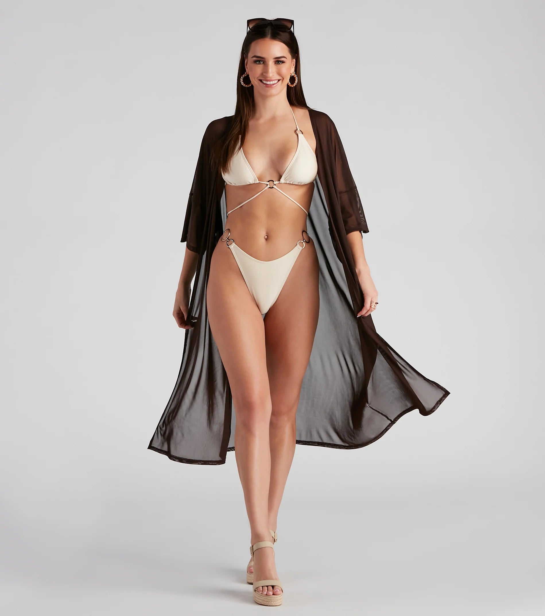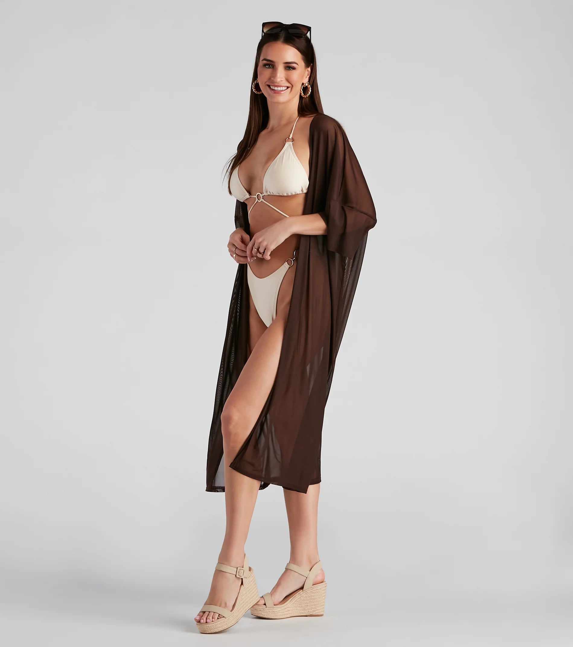 Bring it back to basics with cute layered looks with a flowy kimono! The kimono features a draped open front, long kimono sleeves, and a flowy long length. The kimono is composed of a sheer mesh fabric that offers a relaxed fit with a moderate stretch. Complete the look with a mini dress and sandals.