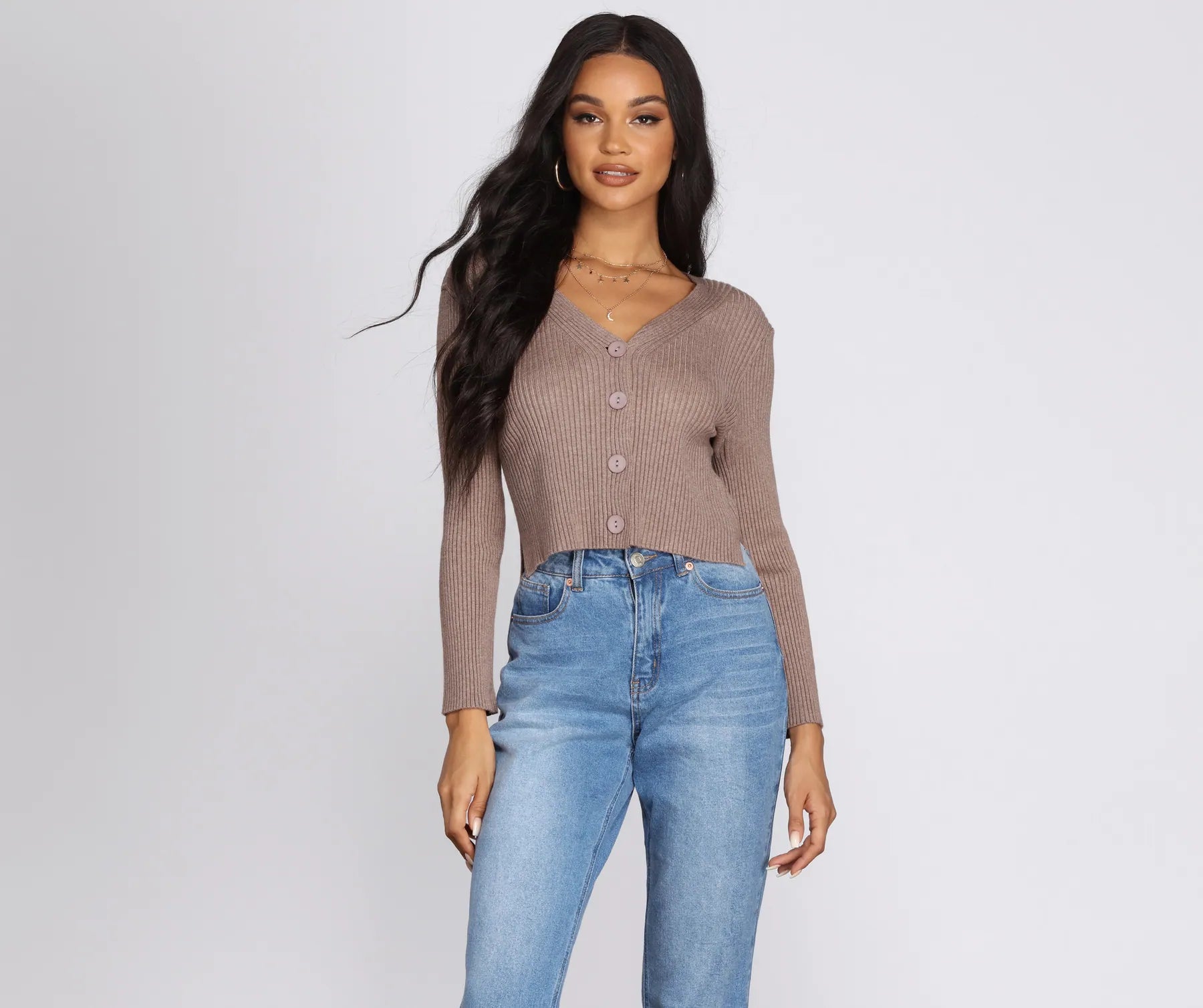 You'll be wearing this super-versatile piece forever, bb! This cardigan features an exposed button front with keyhole accents, a v-neckline, side seam slits and allover ribbed fabric. It's a knitted piece with plenty of stretch for a one-size-fits-all fit.