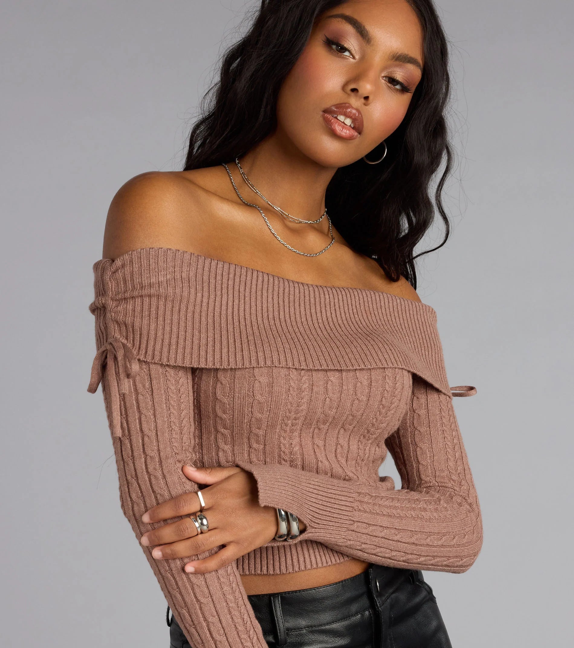 Cozy just got a glow-up. This off-the-shoulder cable knit sweater blends fall comfort with flirty charm, featuring ribbed detailing and tied sleeves for that extra-soft finish. Pair it with leather or your go-to jeans—it’s your new cold-weather crush.