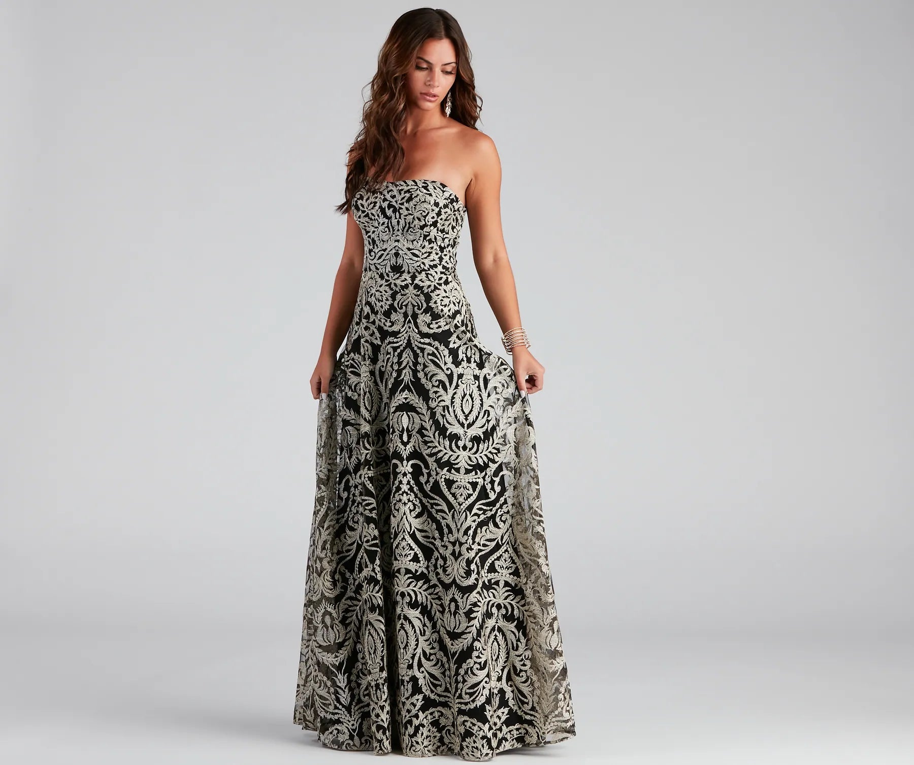 Get swept up in a formal dress that brings the elegance to prom! Filippa features a sleeveless square neckline, supportive padded cups, and removable adjustable spaghetti straps. She features a metallic embroidered baroque pattern throughout that creates a regal vibe. Her slim-fit bodice leads to an enchanting A-line silhouette. She is composed of a lined mesh fabric that offers a flowy fit with minimal stretch. Complete outfit with rhinestone heels and a tennis bracelet.