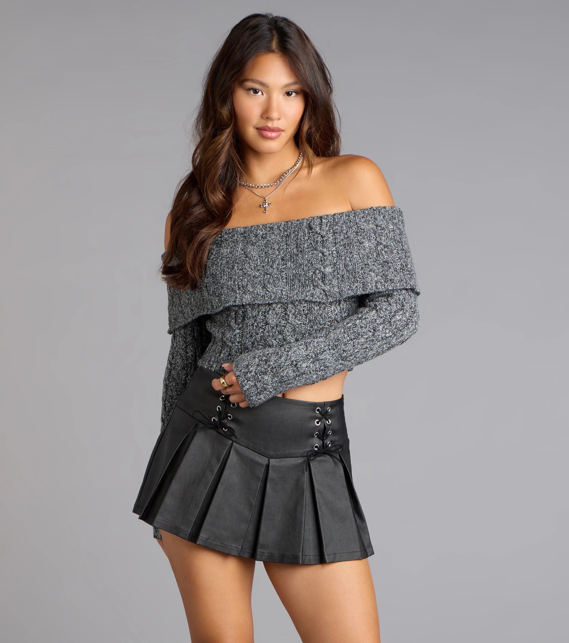 This is what cozy and cute look like. The off-shoulder neckline and foldover design bring just enough flirt, while the soft cable knit keeps it comfy for coffee runs, date nights, or anything in between.