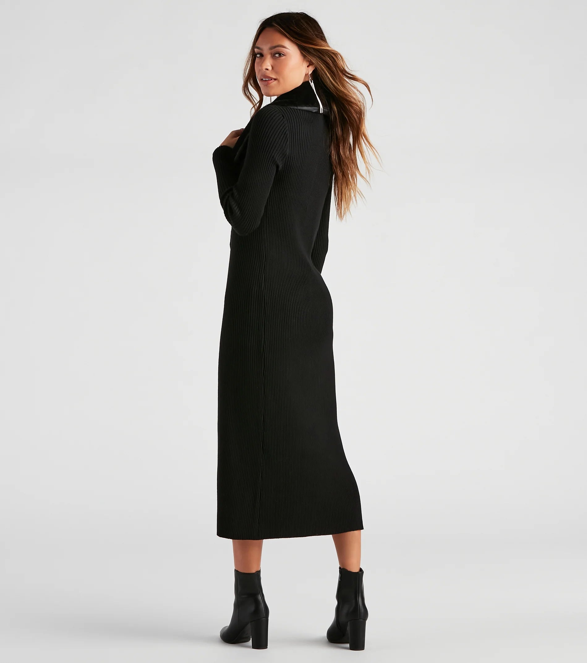 Layer on this chic ribbed knit duster for a forever fabulous look! Featuring a removable faux fur collar accent, long fitted sleeves, a tie-front design, and a long-length flowy silhouette, this duster can be dressed up or down depending on your mood! The ribbed knit fabric offers a moderate stretch. Complete your look with ankle booties.
