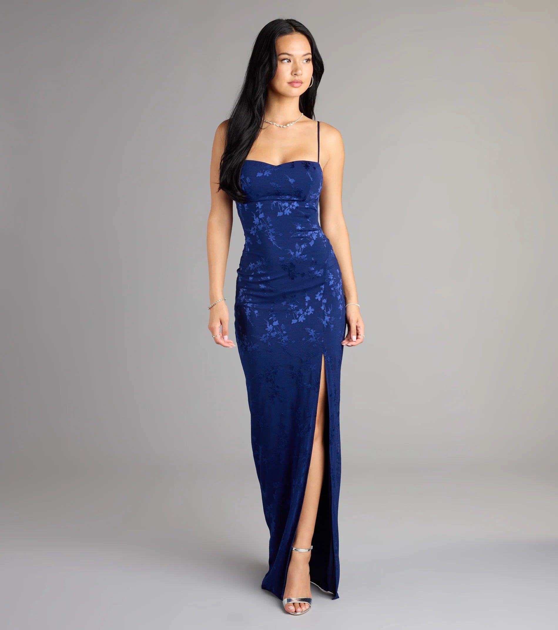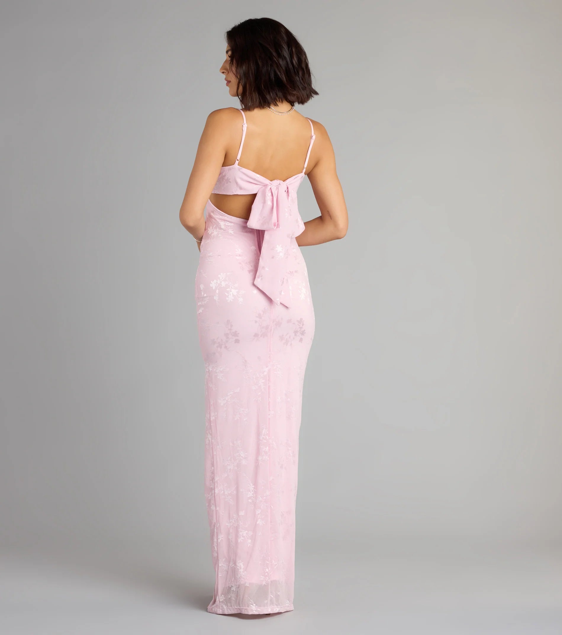 For those moments when only unforgettable will do, the Gabriella formal dress is a vision in floral embroidered mesh, made to glide with you. Its curve-hugging silhouette, high front slit, and delicate tie-back detail bring soft drama with every step.