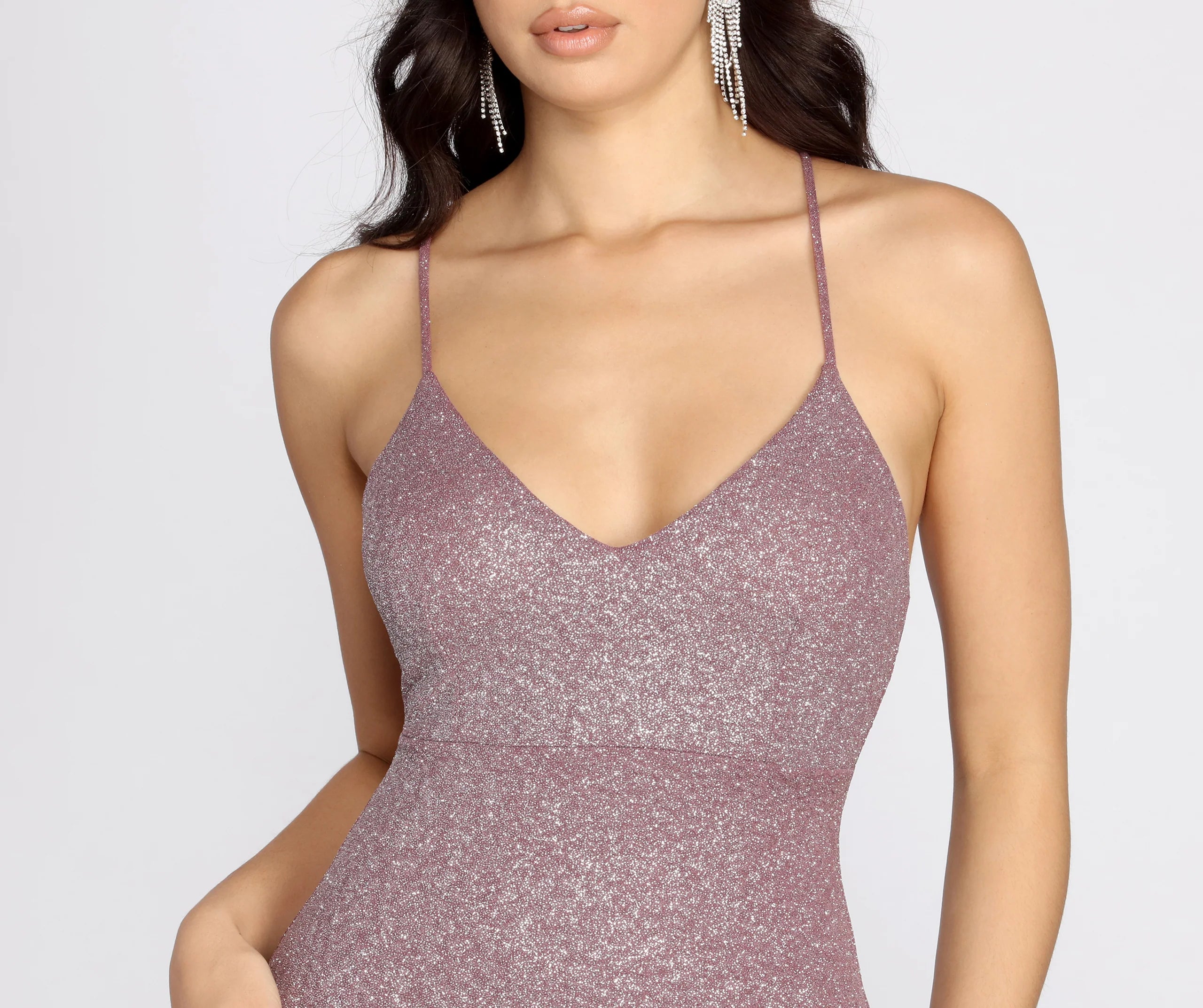 The glow is real in this sparkly glitter dress! It features a flattering V neckline with padded cups, spaghetti straps that cross at the back, a high waist seam, a short, tulip hem, and a curve-hugging silhouette. Pair this dress with a gorgeous rhinestone necklace for a stunning night out look.