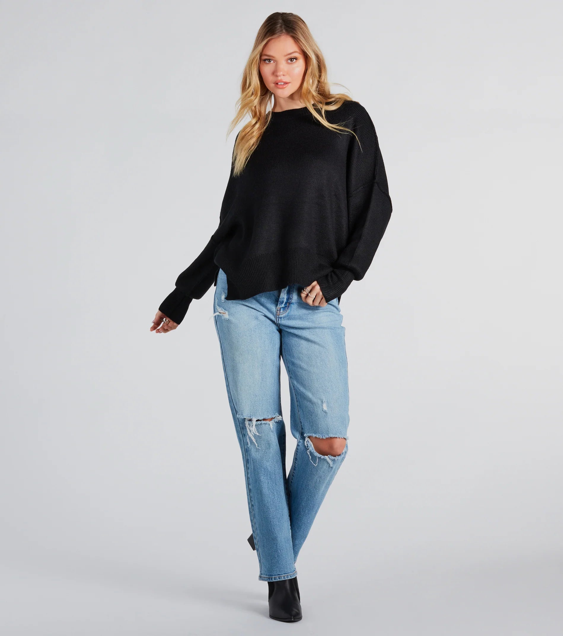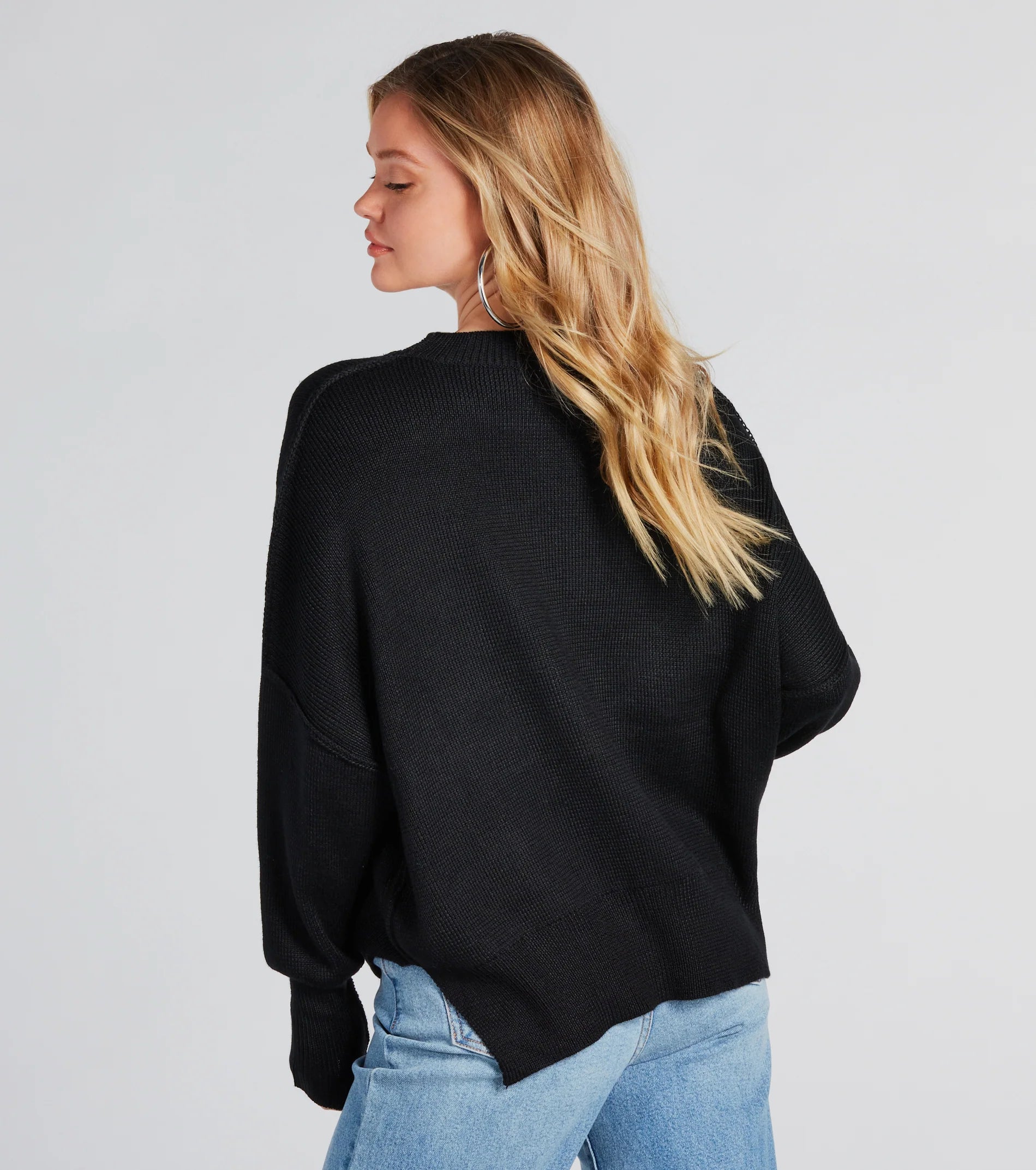 Let the good vibes radiate in this pullover sweater! With its crew neckline, long sleeves, oversized fit, soft knit fabric, and side slit accents, you'll look fashion-forward and feel comfortable all day. Complete the look in denim jeans for movie dates or hangs with friends!