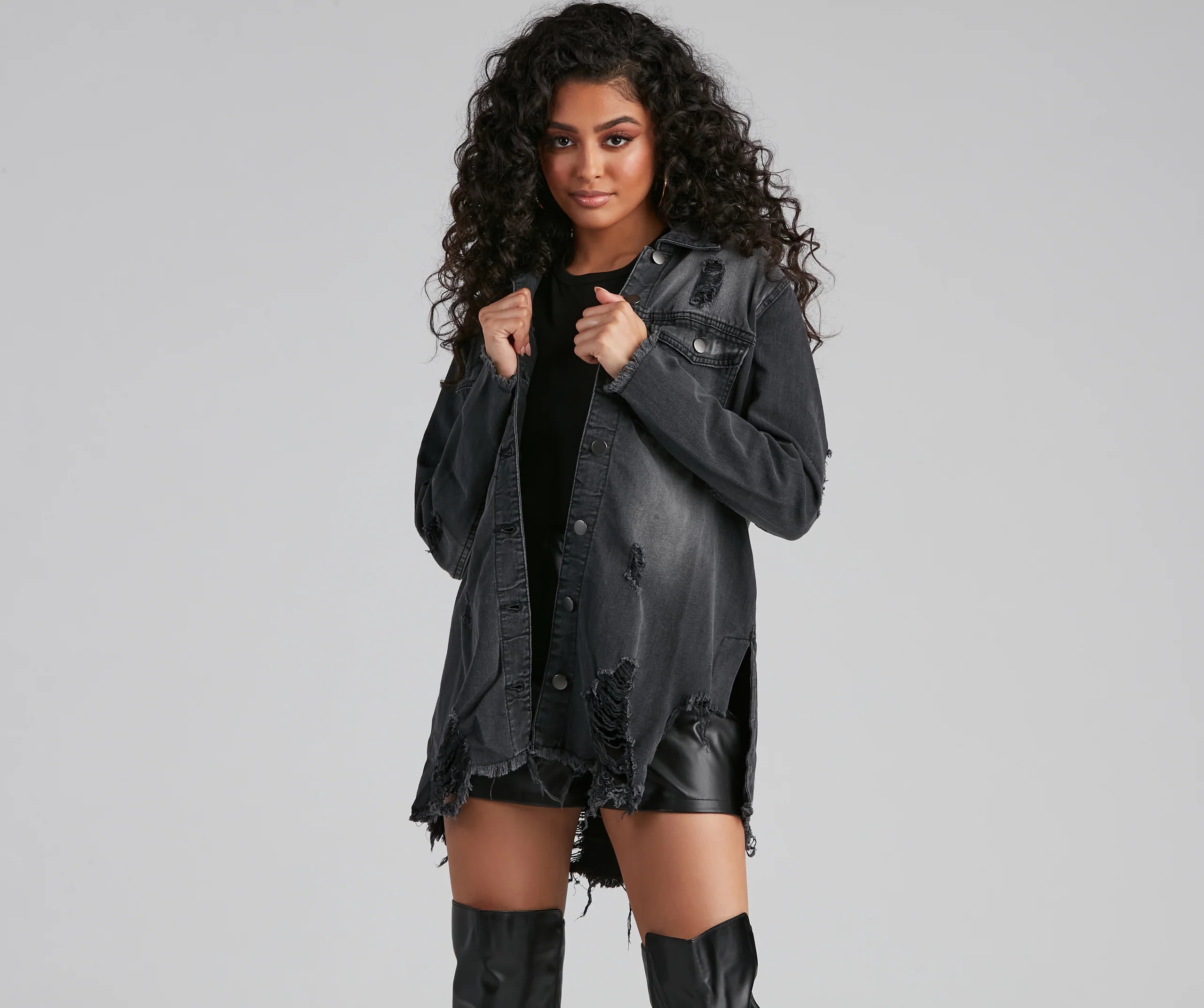 Keep it grunge and glam with a denim shacket that brings a major edge! The shacket features a collared neckline, a multi-button down front, two chest pockets, long sleeves, heavy destruction throughout, and a longline length with raw edge hem. The shacket is composed of a denim fabric that offers a relaxed fit with minimal stretch. Complete look with boots.