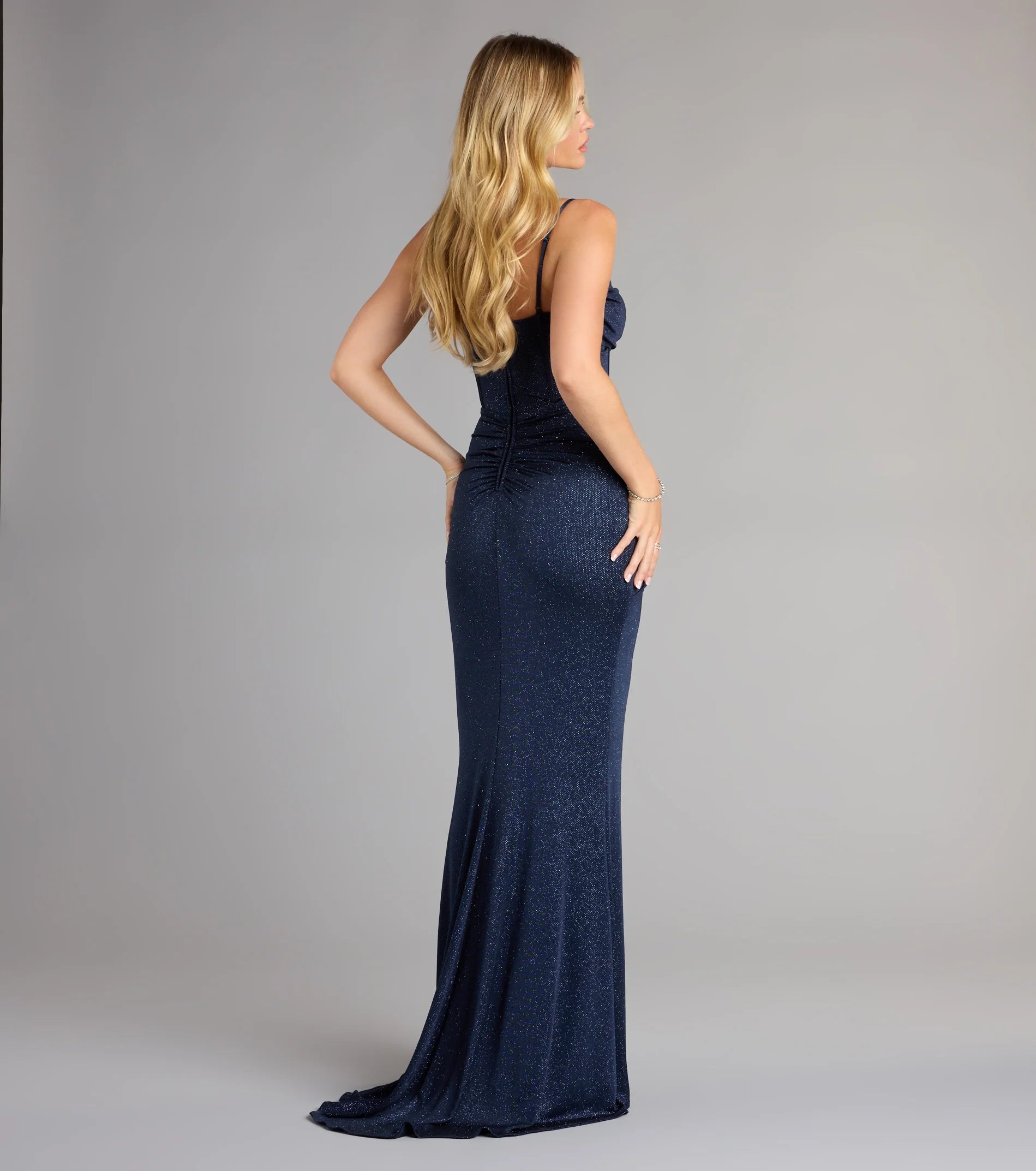 Designed to catch every eye in the room, the Gwen floor-length glitter gown balances structure and shimmer with a sculpted corset bodice and a high front wrap slit. The mermaid silhouette ensures a striking exit to match your entrance.