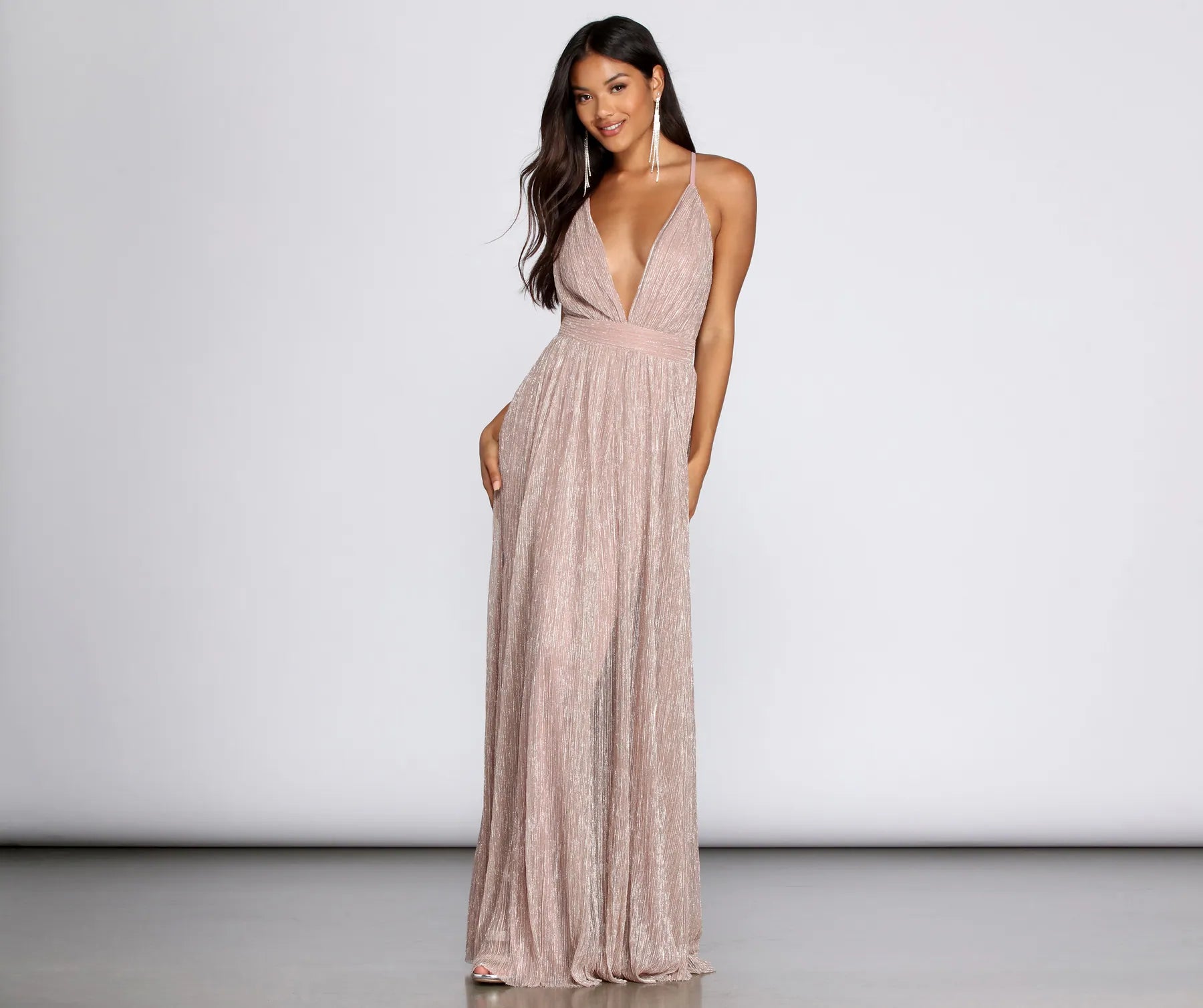 Glow from within as your radiate your natural beauty in our shimmering Haley dress! She features a sleeveless bodice, a plunging V neckline and narrow adjustable straps that lead to a cross back design. Her slim fit bodice leads to a narrow waist band accent and flows into a sweeping floor length skirt with pleated detailing throughout. She is composed of a metallic mesh fabric that offers a relaxed fit with minimal stretch. Dress is lined with a smooth knit fabric and includes a back zipper closure.