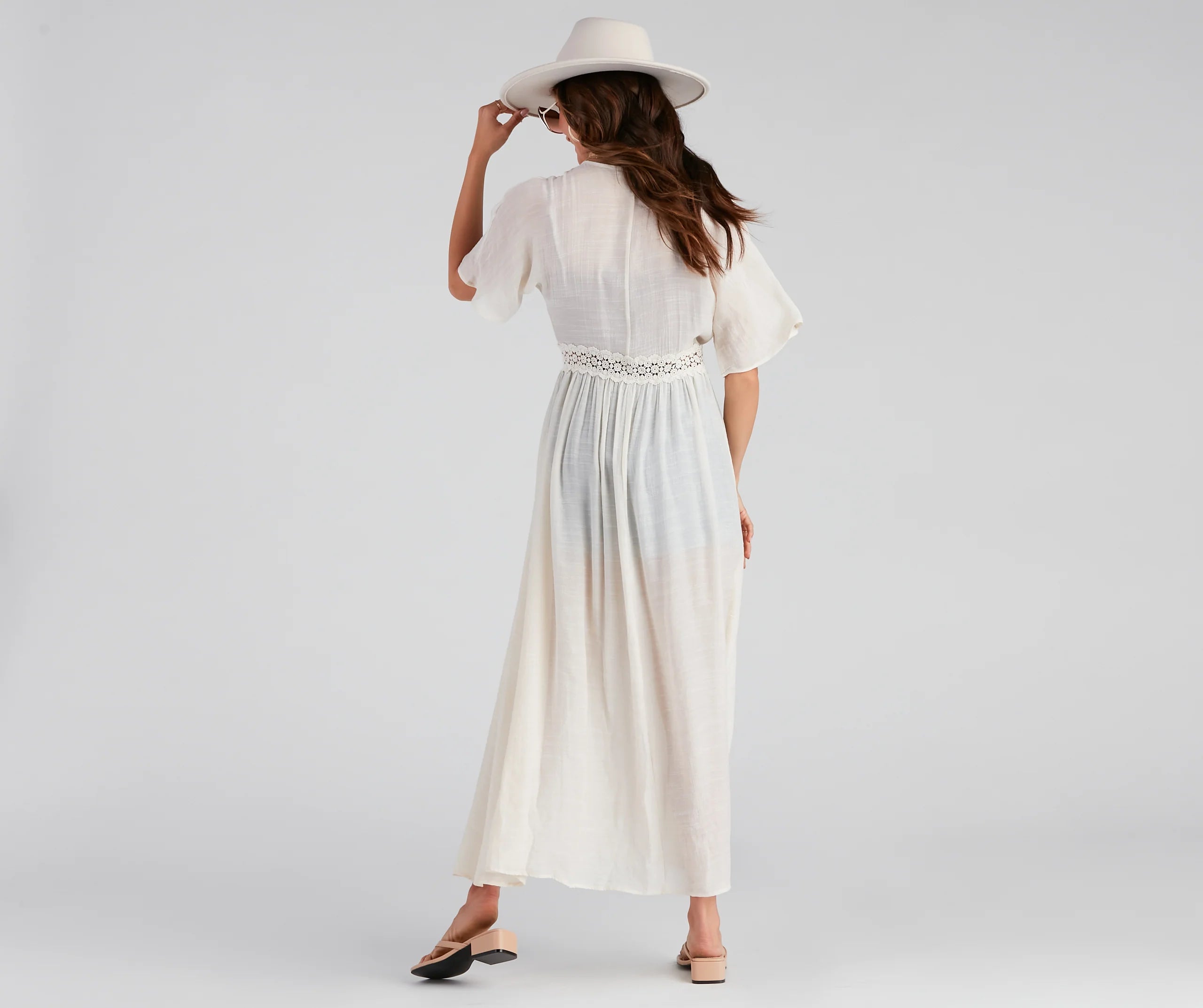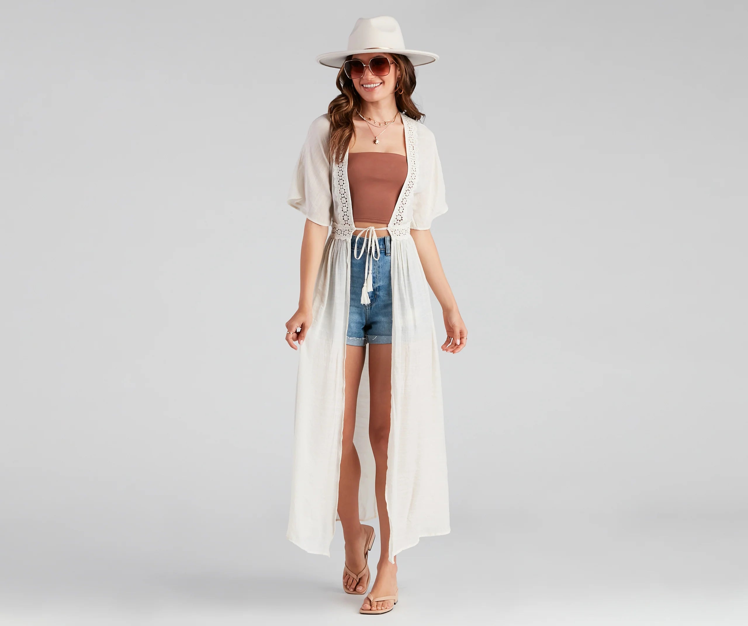 Head out to the Hamptons in this effortlessly stylish duster featuring flowy short sleeves, open-front design, crochet trim, tie-front closure, and a long-length hem on gauze-woven fabric. Complete the look with a chic hat and oversized sunglasses.