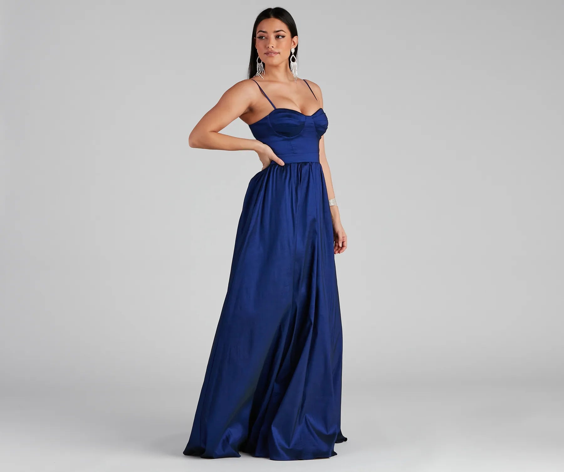 Many kodak moments will be made while wearing the Helen formal dress! She's dressed to impress at prom in her sleeveless, bustier-style bodice with adjustable spaghetti straps, a sweetheart pleated neck, and an open back with a stunning lace-up design. Her fitted empire waist effortlessly flows in an a-line silhouette to elongate your figure and she includes side hidden pockets to keep your hands warm. Composed of a metallic woven fabric with inner tulle and knit lining with minimal stretch. Finish your radiate prom look with a chic clutch.