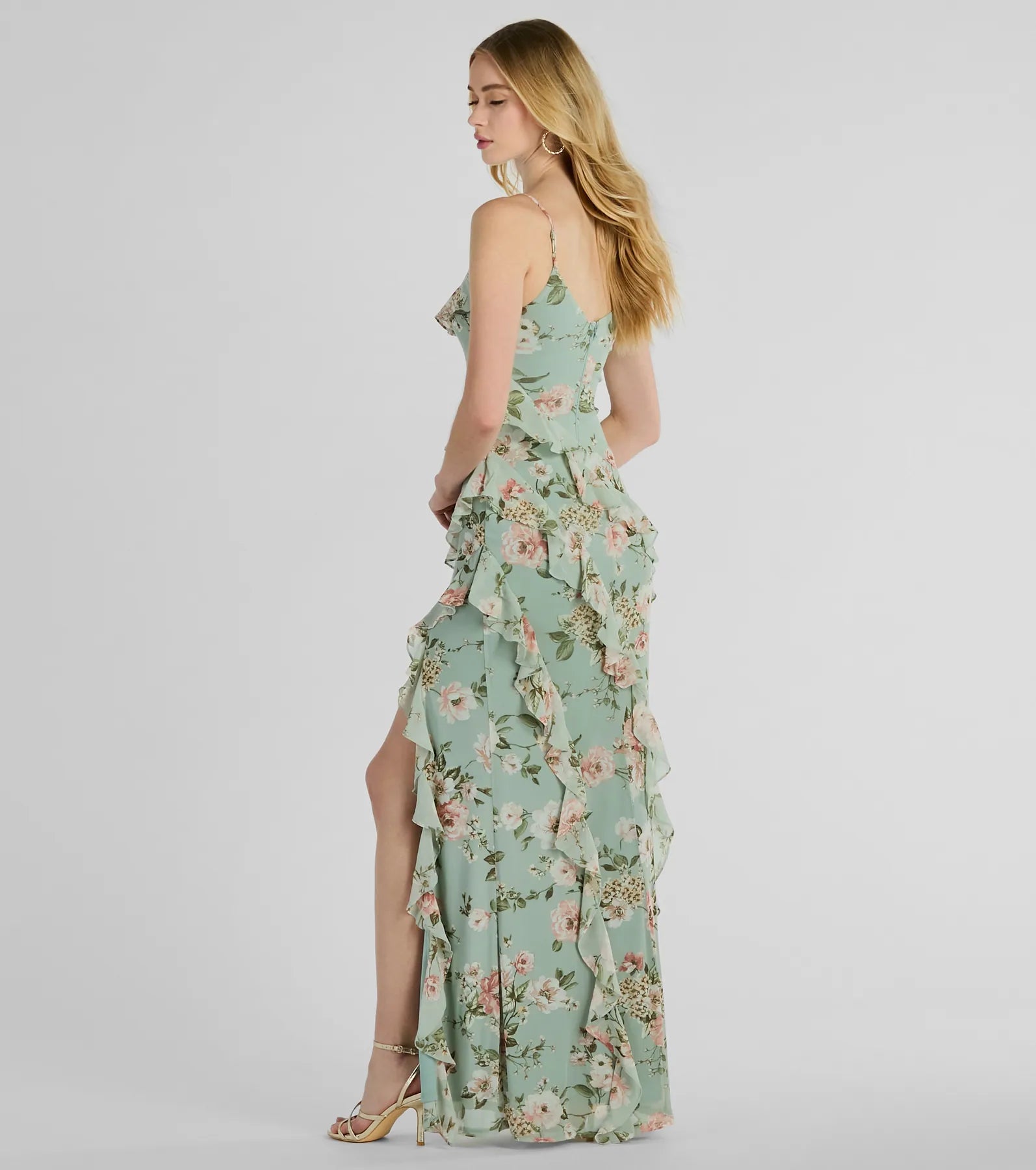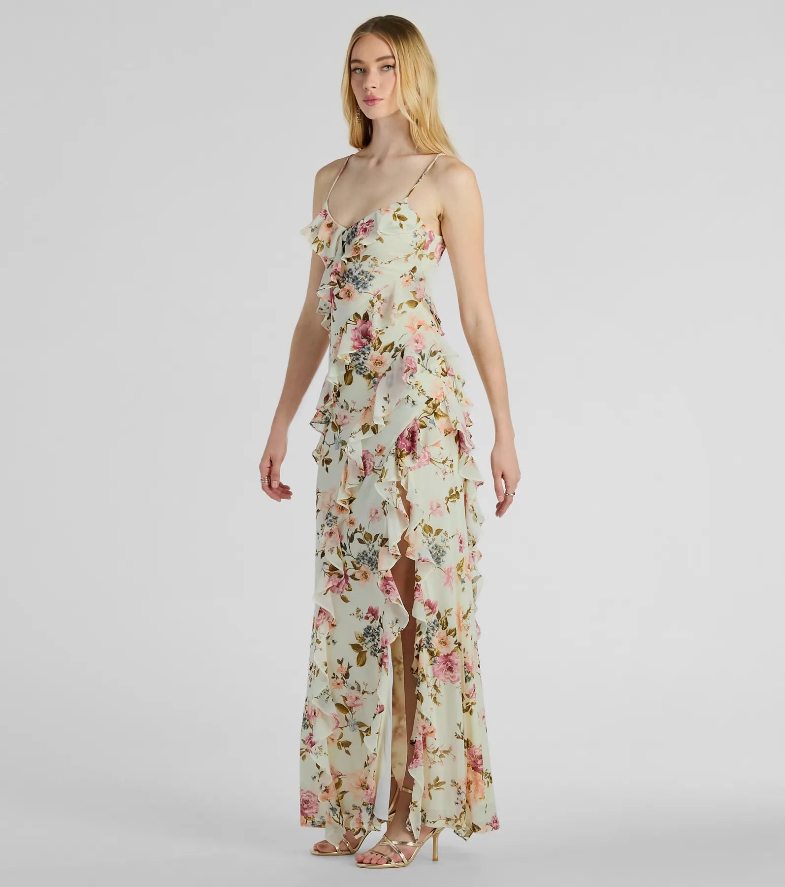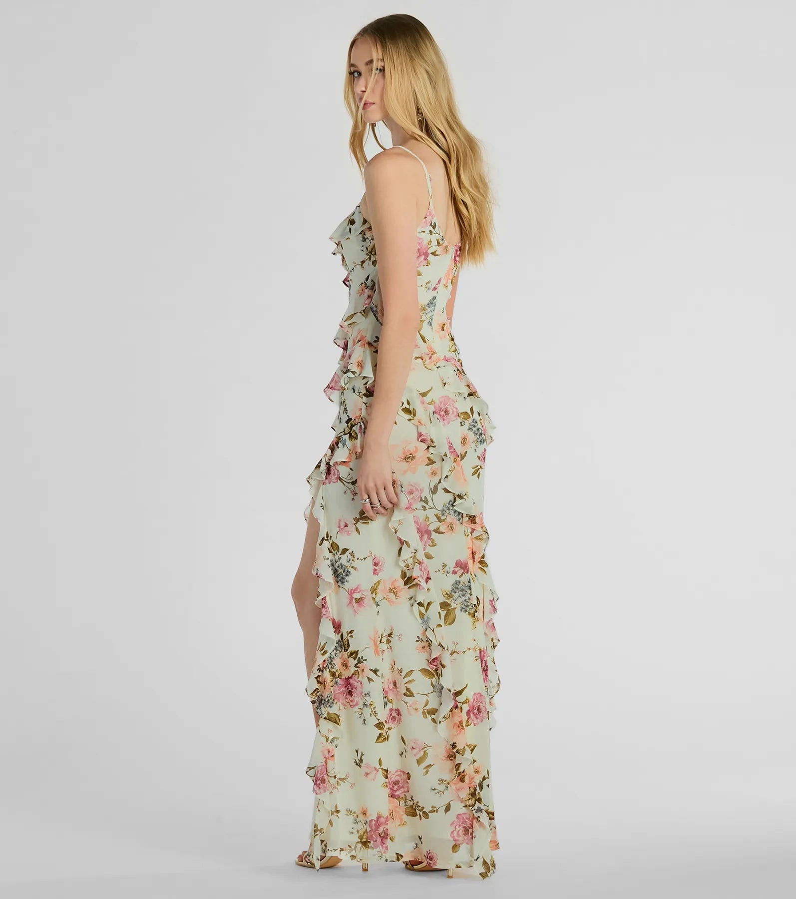 Complement your darling charm in the Helga floral formal dress at weddings, banquets, or garden parties! Designed with playful asymmetrical ruffles throughout the mermaid silhouette and a high front slit, this chiffon dress is perfect for your next formal event. The garden floral print adds a touch of whimsy while the V-neckline flatters and adjustable spaghetti straps ensure a perfect fit. Finish the look with earrings, a clutch, and lace-up heels.