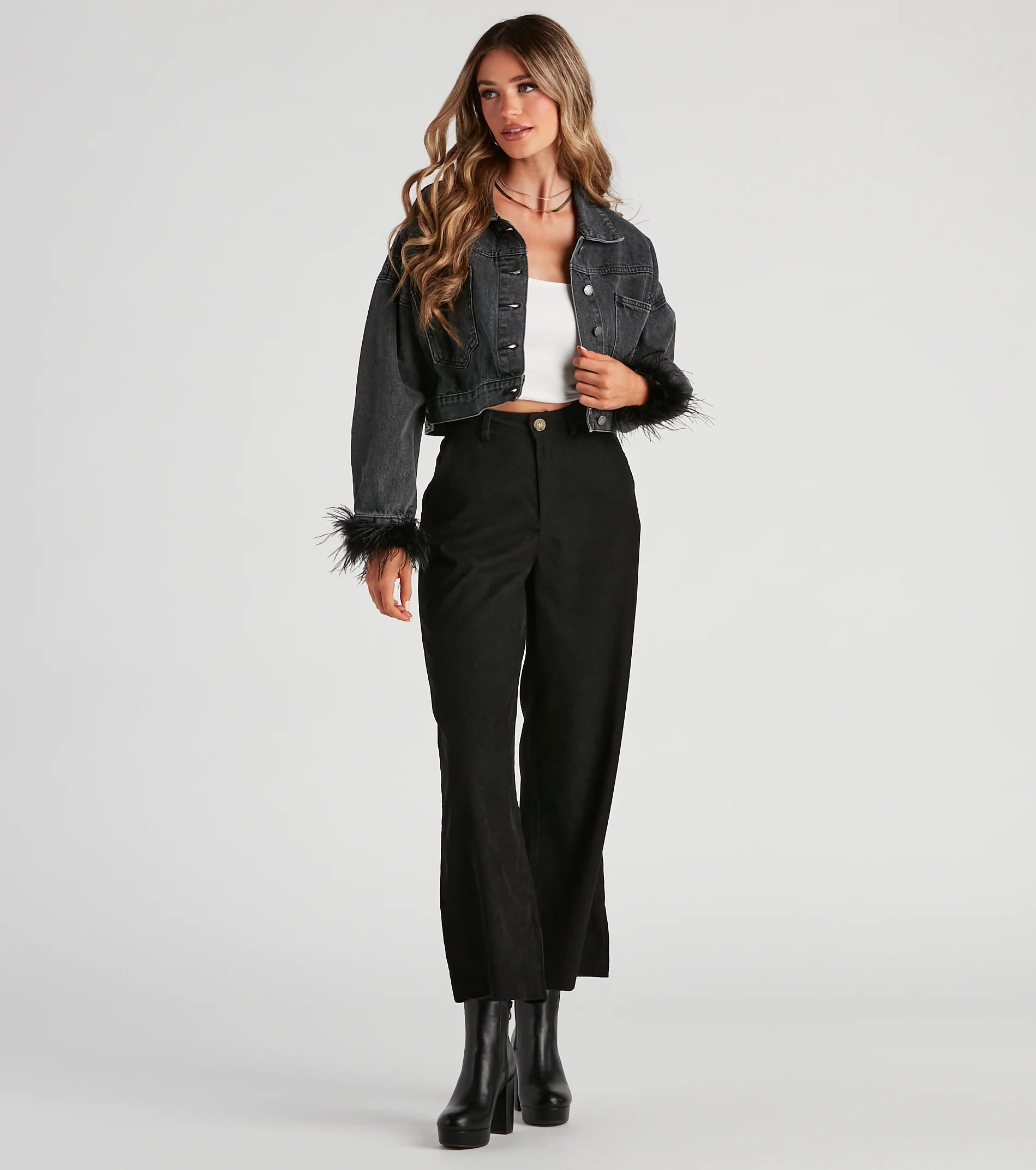 Why blend in when you can stand out in this stylish denim crop jacket? It features slouchy long sleeves with marabou feather trim cuffs and button closures, a collar neckline, front pockets, and a button-down front placket. Complete the look in block heel booties.