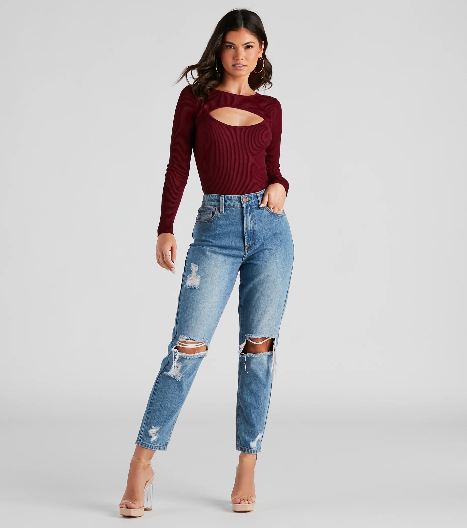 Coming up with a plan for everyone to see you in this sweater bodysuit can definitely be arranged! The rib knit bodysuit top features long sleeves, crew neck, front keyhole cutout, and a thong cut bottom with dual snap-button closures. Complete the look in high-rise jeans.
