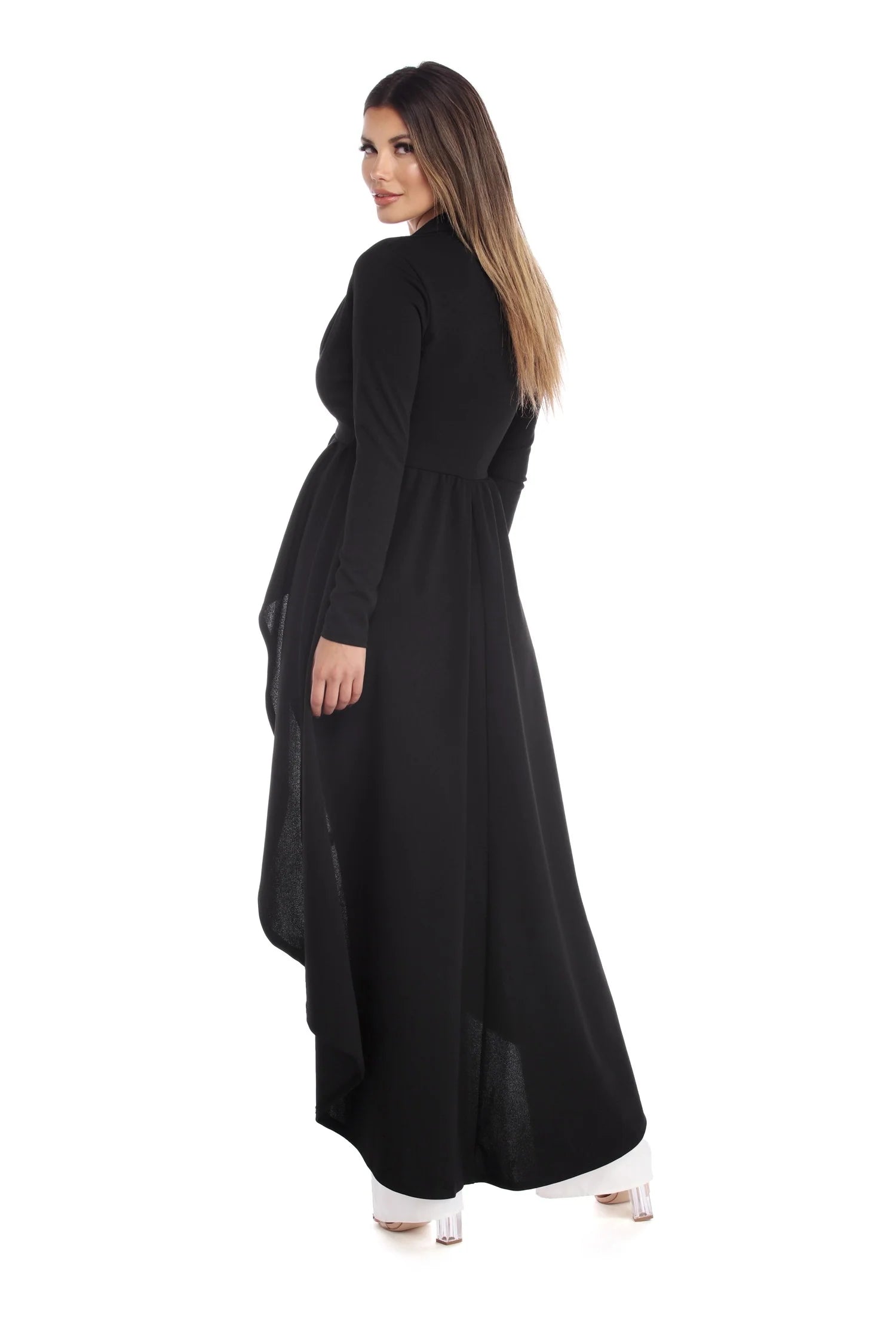 Class it up with this stylish piece! The jacket has a sophisticated collar paired with long sleeves along with a two row hook and eye closure. The slim bodice meets a dramatic high-low skirt with an unforgettable flare and has a fully lined crepe knit fabric.