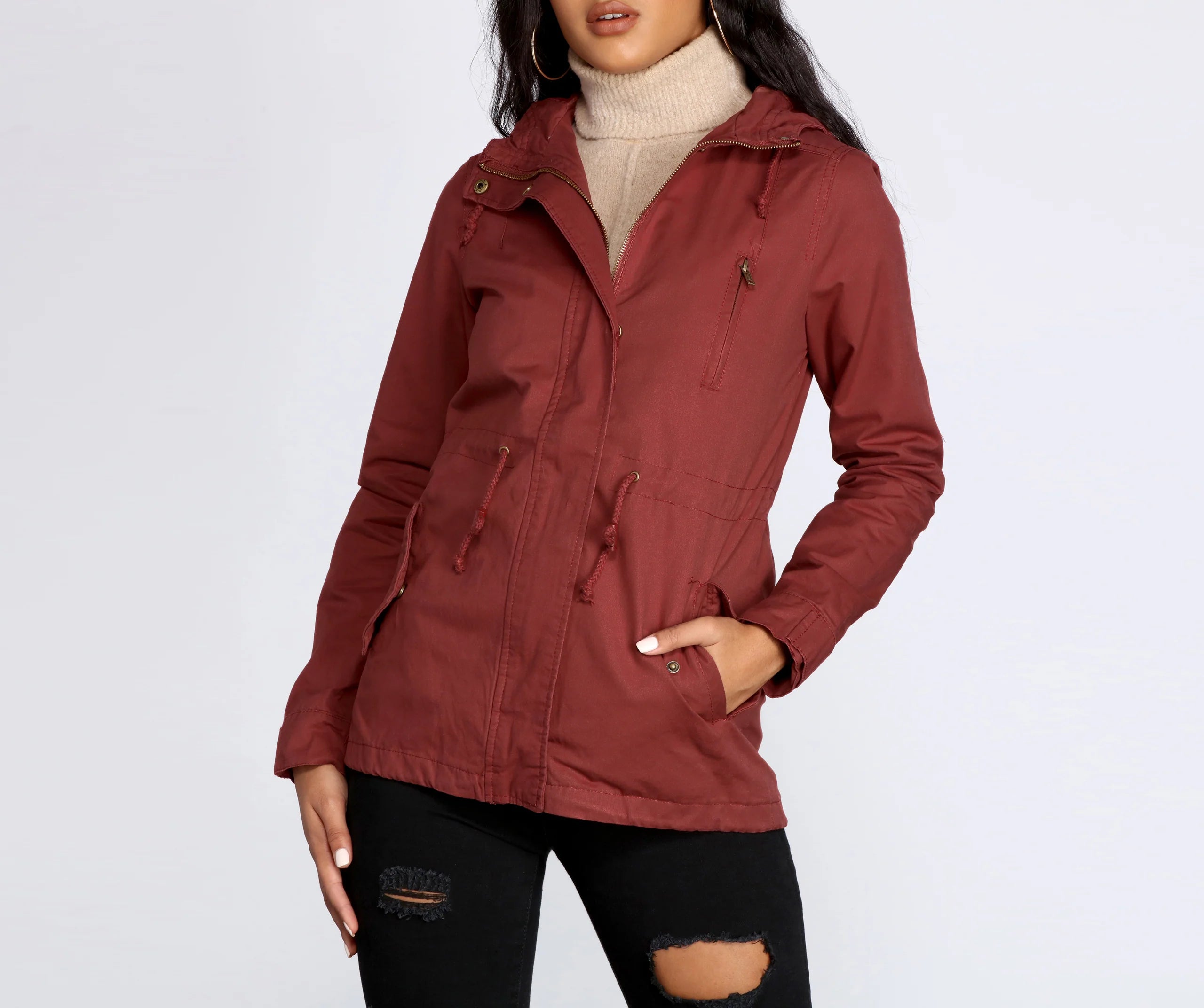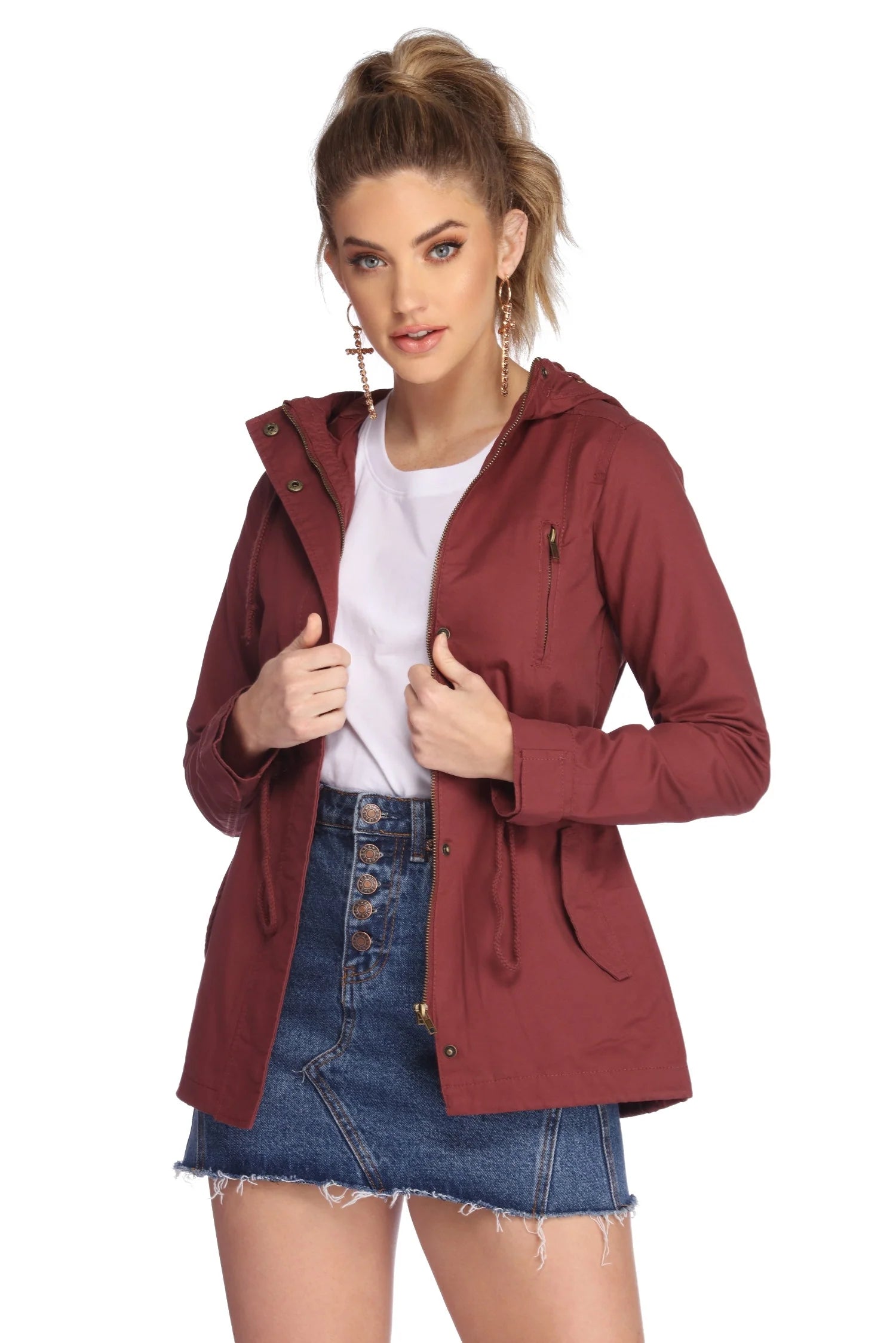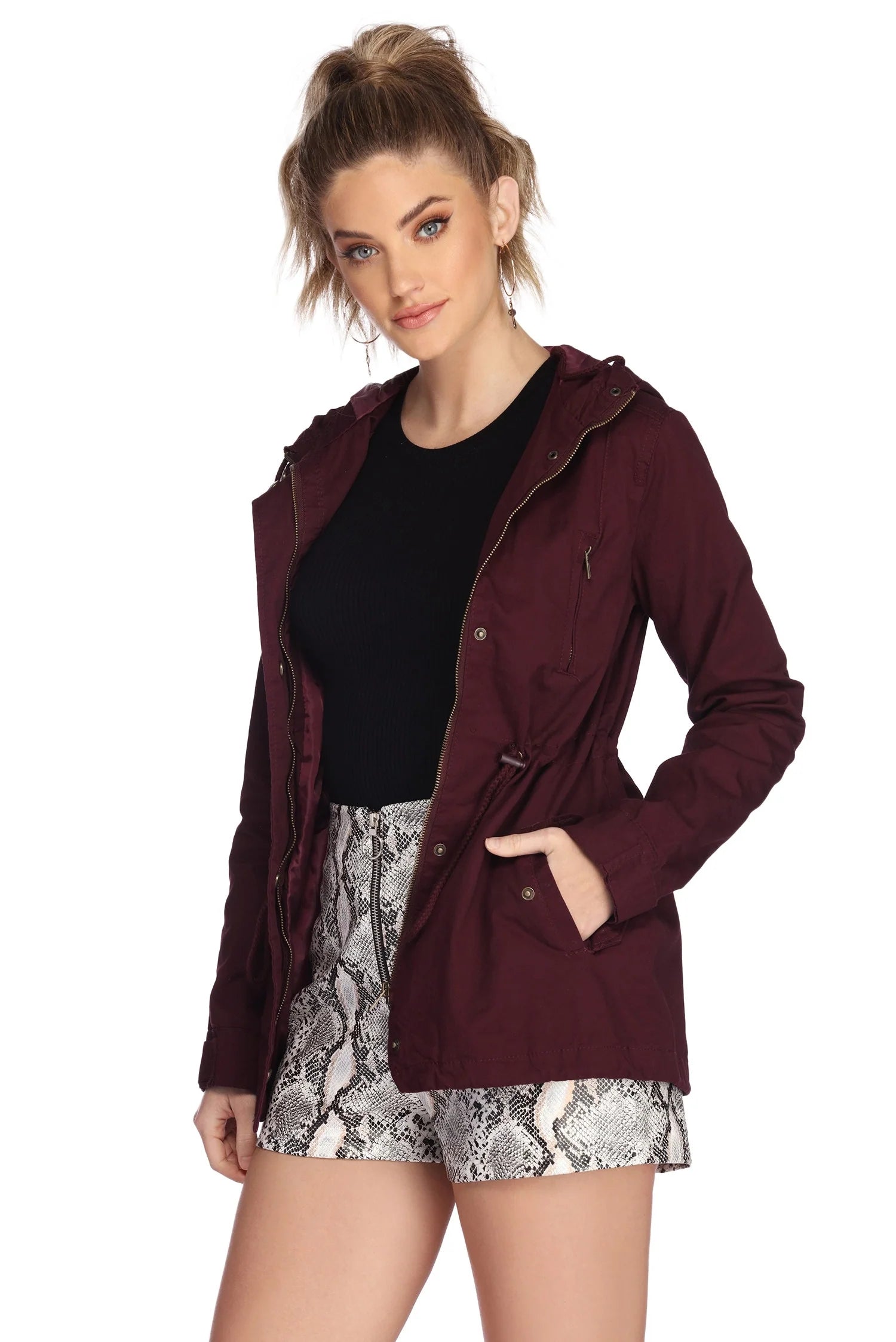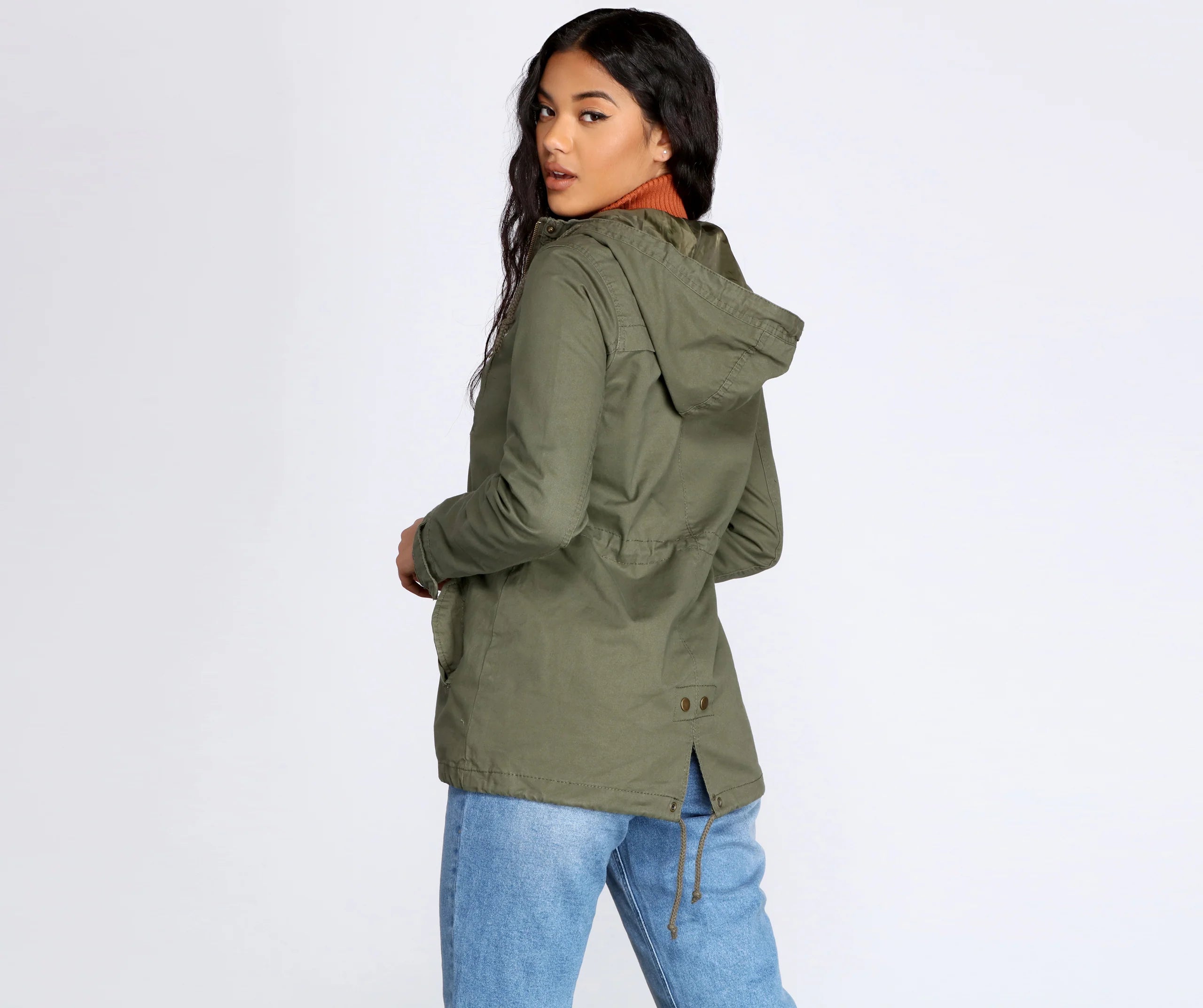 Head out for an adventure with this causal cute anorak! It features a drawstring hood, a front zipper and button down closure, a drawstring waist, zippered and buttoned pockets, long sleeves with button details, and a back drawstring. The jacket is composed of a lined woven fabric with no stretch.