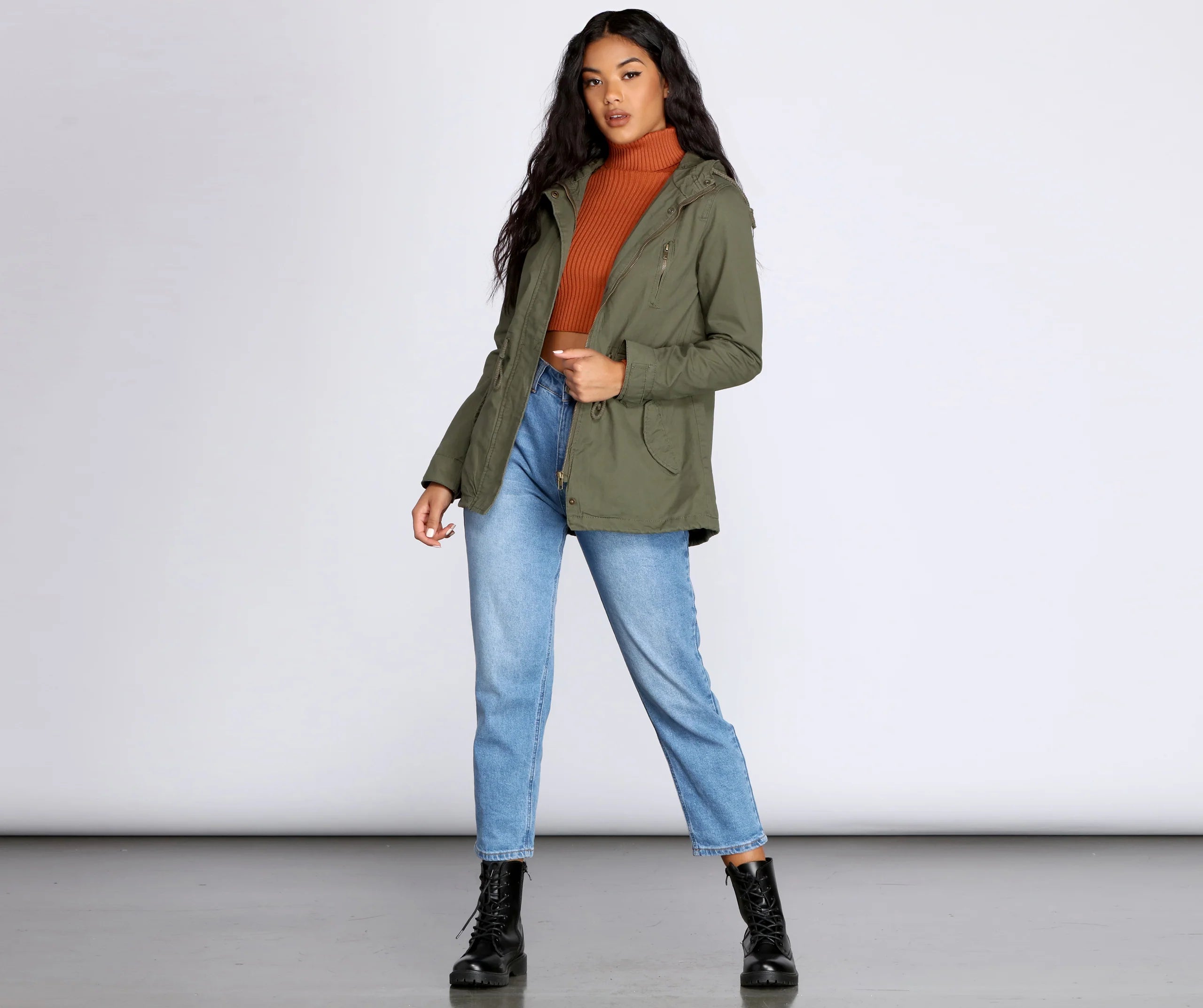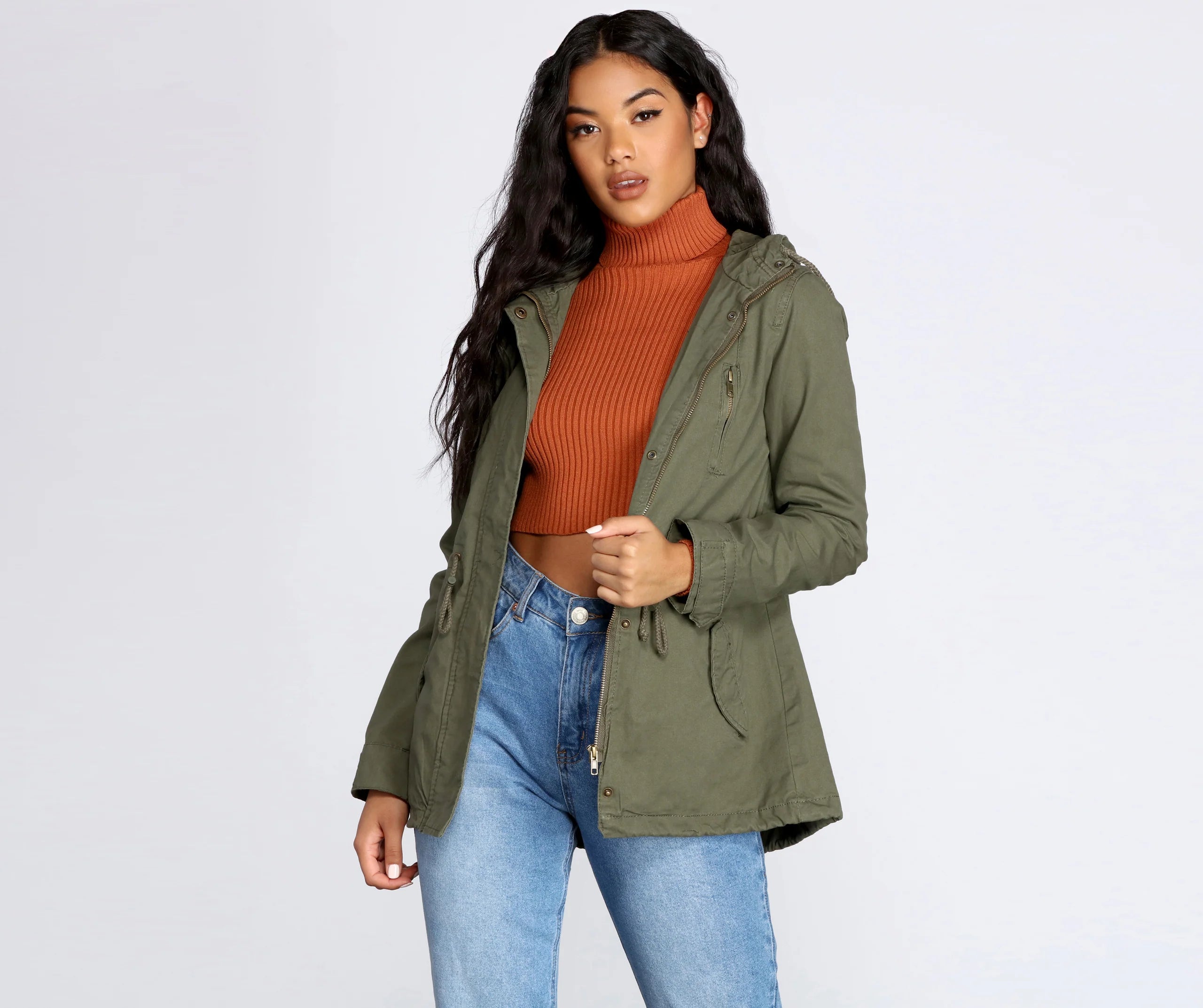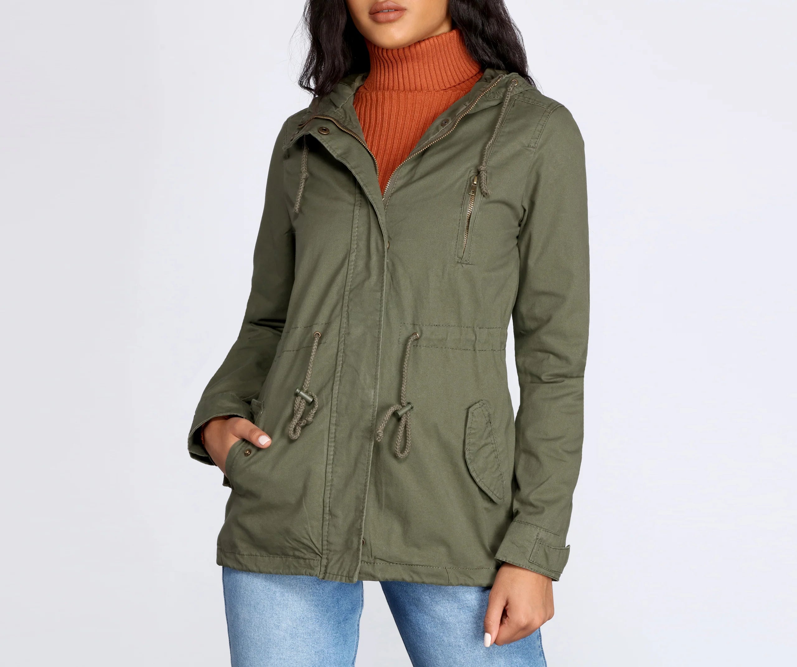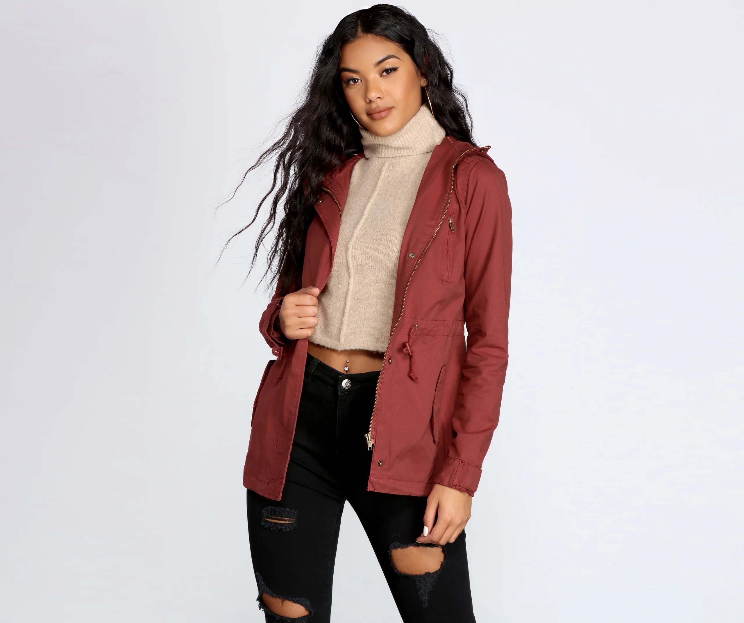 Head out for an adventure with this causal cute anorak! It features a drawstring hood, a front zipper and button down closure, a drawstring waist, zippered and buttoned pockets, long sleeves with button details, and a back drawstring. The jacket is composed of a lined woven fabric with no stretch.