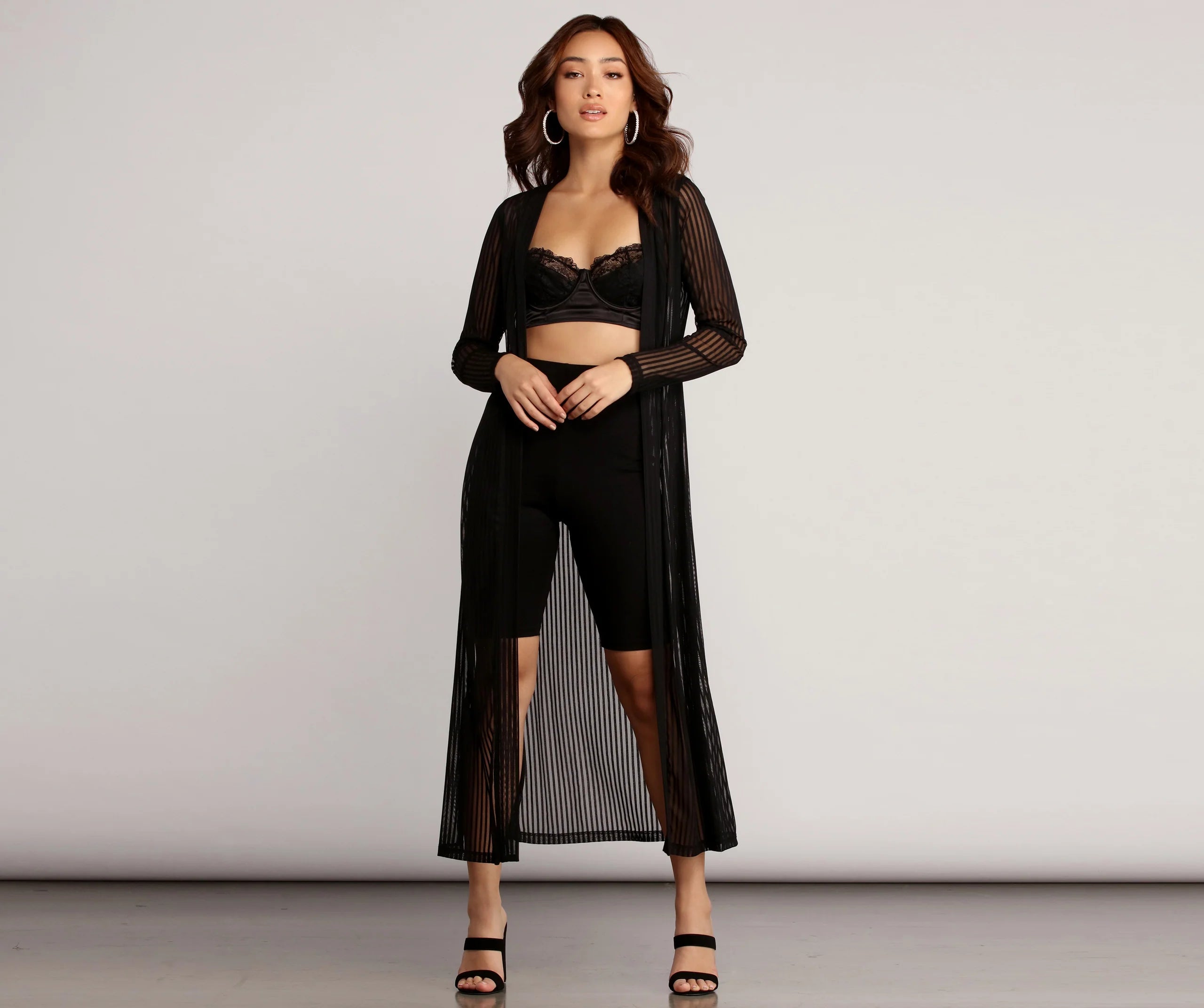 Play peek-a-boo in this strategically striped mesh duster! Pair it with anything from a tank and jeans to your fave lacy lingerie. Duster features an open front, long sleeves, and contrast trim at cuffs, hem, and front. It's made from a featherweight mesh material with minimal stretch.
