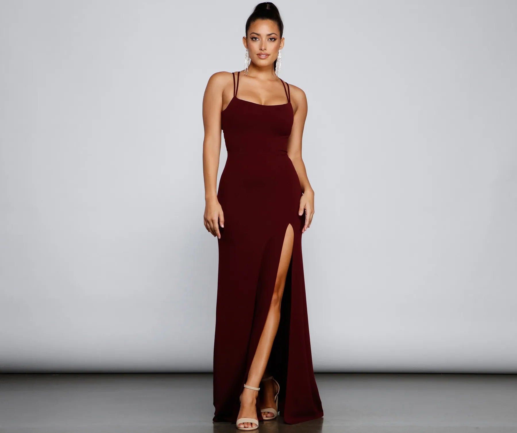Make a captivating entrance in a formal dress that showcases your timeless elegance! Jaelynn features a sleeveless square neckline, a double-row of spaghetti straps, a bold high side slit, an open back with sleek bar straps, and an A-Line silhouette. The dress is composed of a crepe fabric that offers a form-hugging fit with a moderate stretch. Complete look with rhinestone heels and a tennis bracelet.