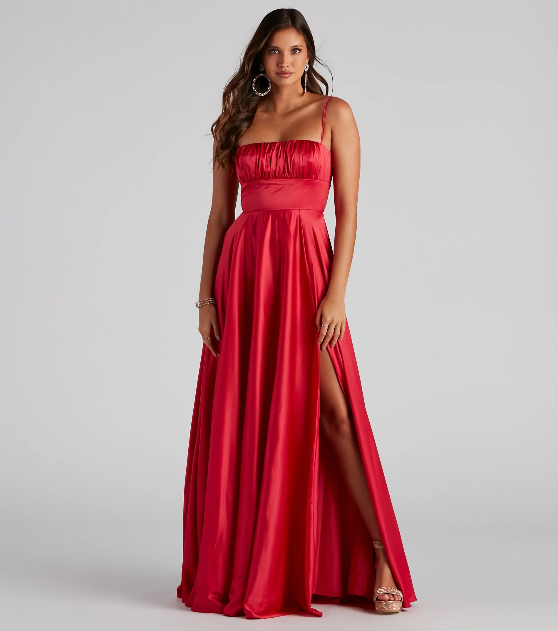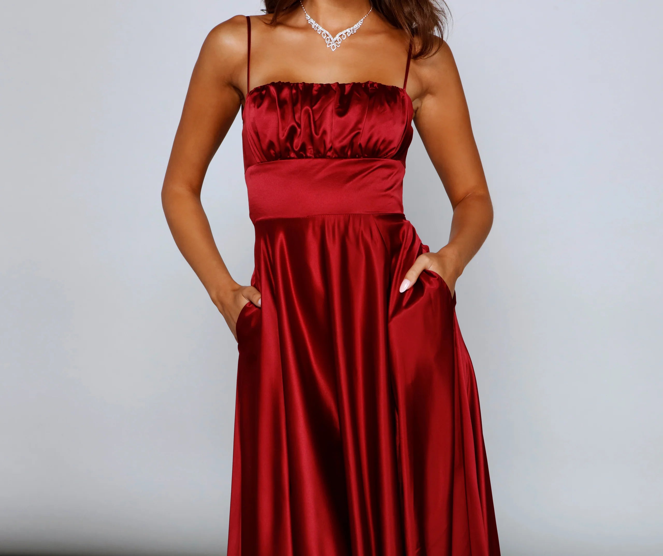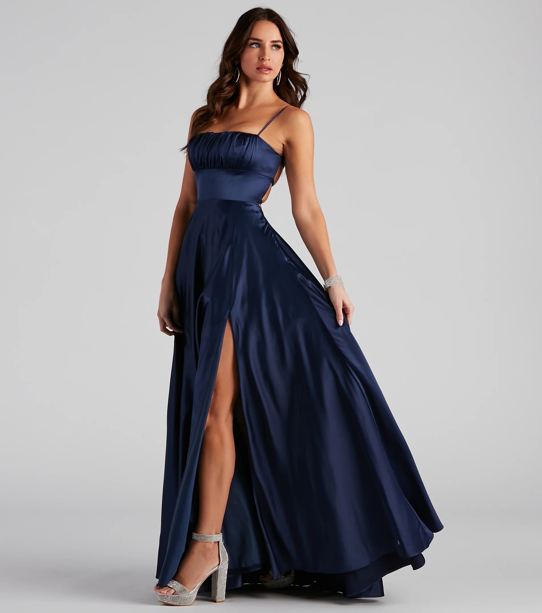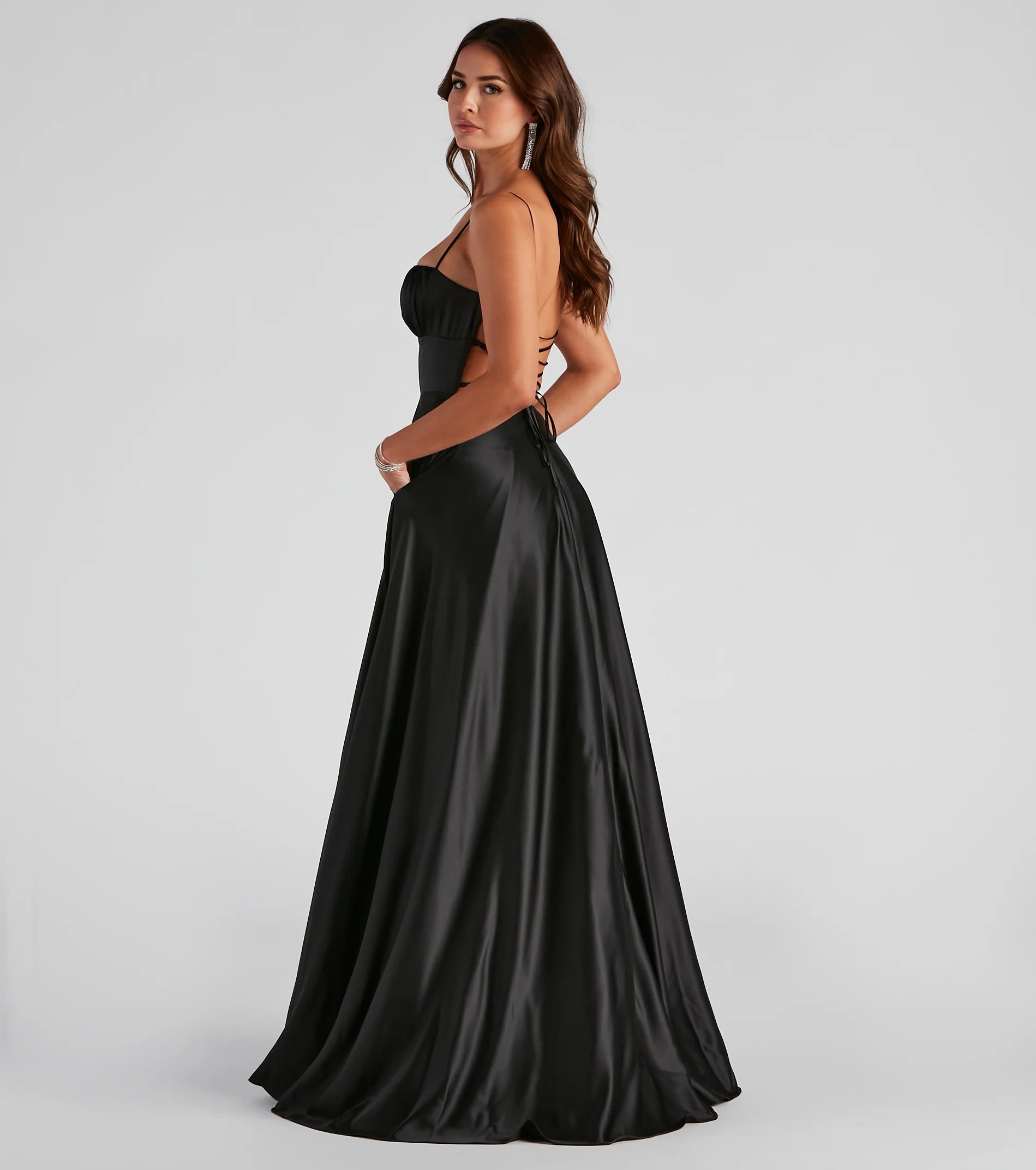 Bring the drama in the eye-catching and chic Jenny satin formal dress. She features a sleeveless square neckline with ruched detailing, adjustable spaghetti straps, and a sultry lace-up back design. Her flattering high waist seam flows out to a floor-length A-line silhouette with side pockets and a thigh-high front slit. Style this dress with rhinestone statement earrings and a sleek clutch.