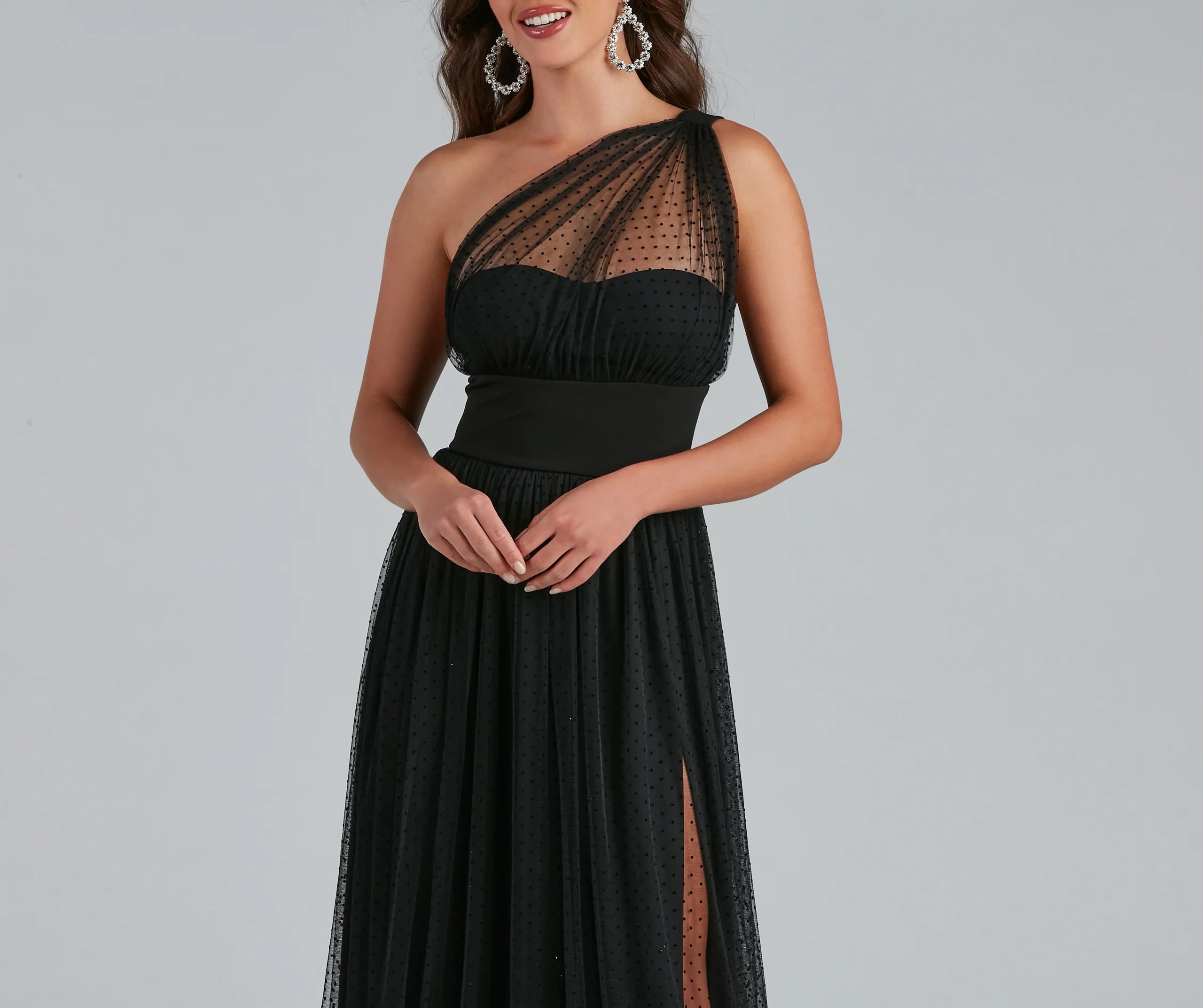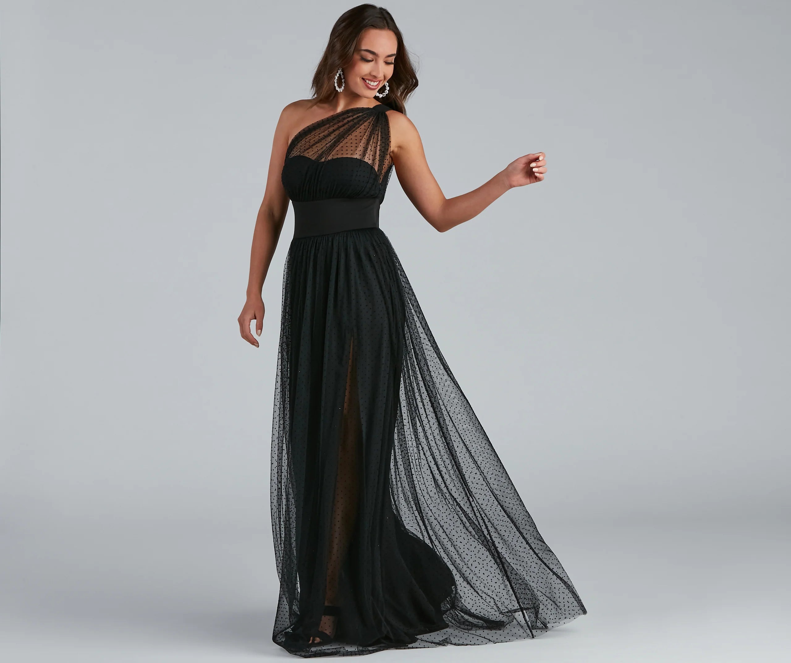 Strike a pose in the sophisticated Jessy swiss dot cowl a-line formal dress sure to captivate every party. She features a strapless, sweetheart cowl neck with a built-in padded bust for a supportive fit and a fitted empire waist. Her figure-flattering a-line silhouette effortlessly sweeps into a floor-length hem perfect for twirling the night away! Composed of a swiss dot mesh overlay fabric with an interior lining with no stretch. Style with rhinestone earrings and a sleek clutch.