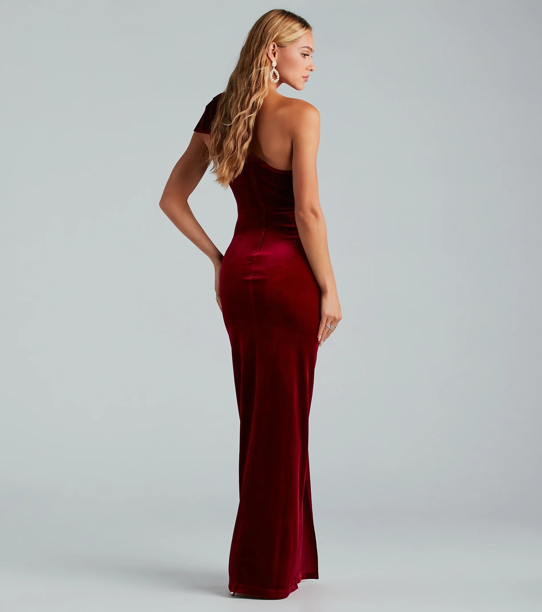 A luxurious style with decadent detail, the Joyce formal velvet dress captivates everywhere she goes! Featuring a sleeveless one-shoulder neckline adorned with a statement bow shoulder strap, a pleated waist trim, a mermaid silhouette that flaunts your gorgeous curves, and a high front slit and floor-length hem. The formal dress is crafted from a soft velvet knit fabric that brings glam vibes to your night! Complete the look with a rhinestone hair accessory and heels for a red carpet event or holiday party!