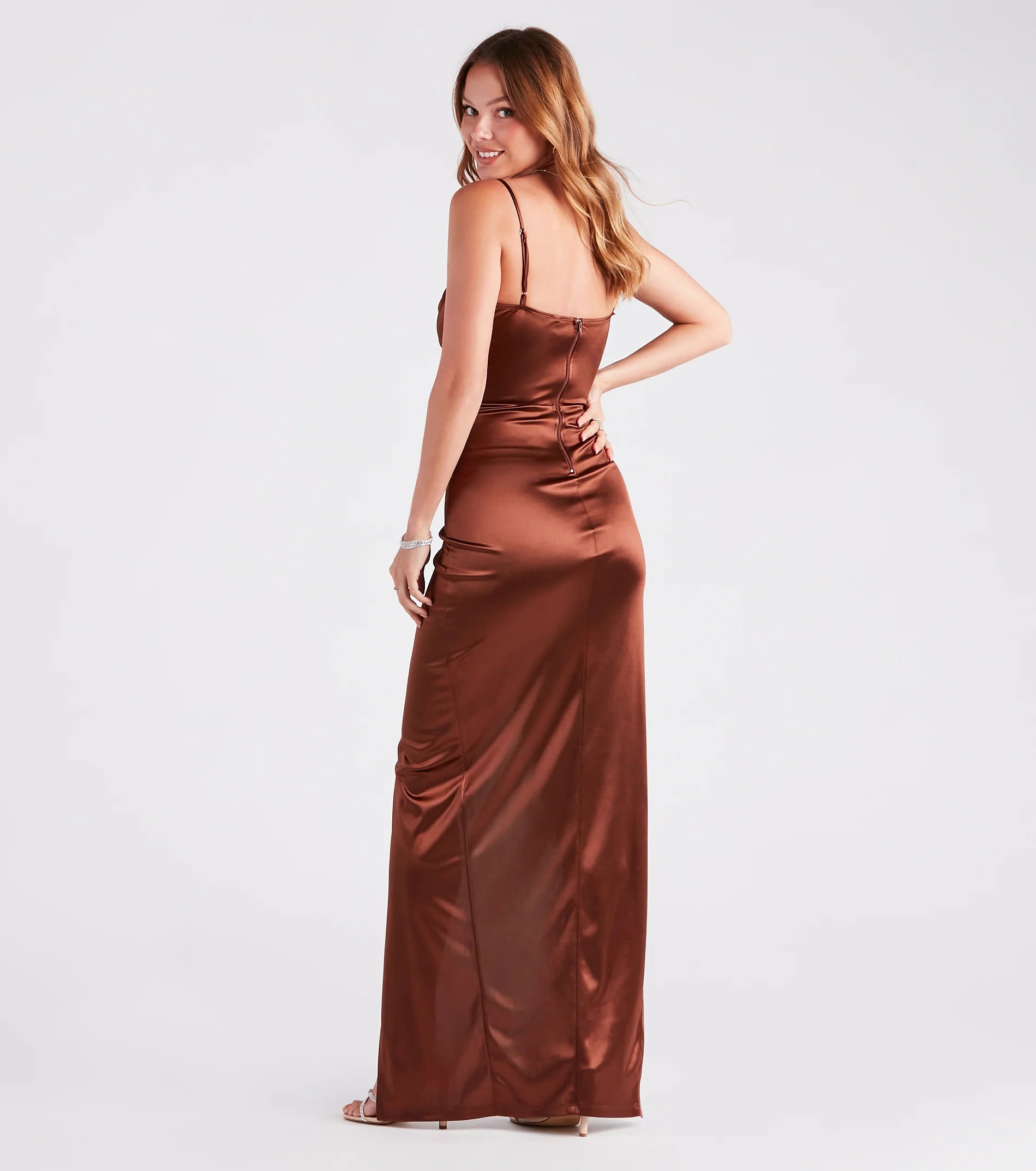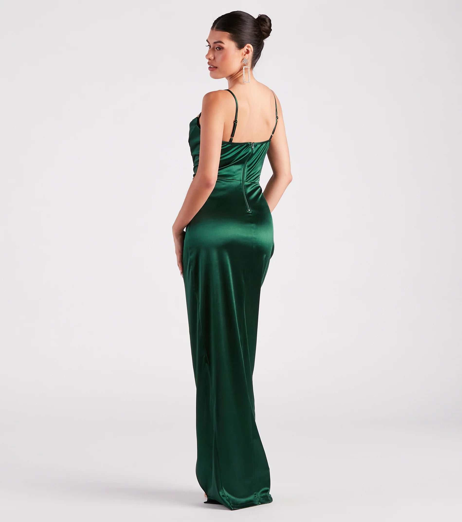 The luminous shine on the Juliet formal satin dress is all you need to stand out from any crowd! A striking style for galas, bridesmaids, or award banquets. She features a classy sleeveless cowl neckline, adjustable spaghetti straps, flexible boning inserts along the bodice, and a flattering asymmetrical wrap slim silhouette with a long hem. The formal dress is composed of lined silky satin fabric with moderate stretch and a sheen effect. Complete the look with sparkly hoop earrings and heels.