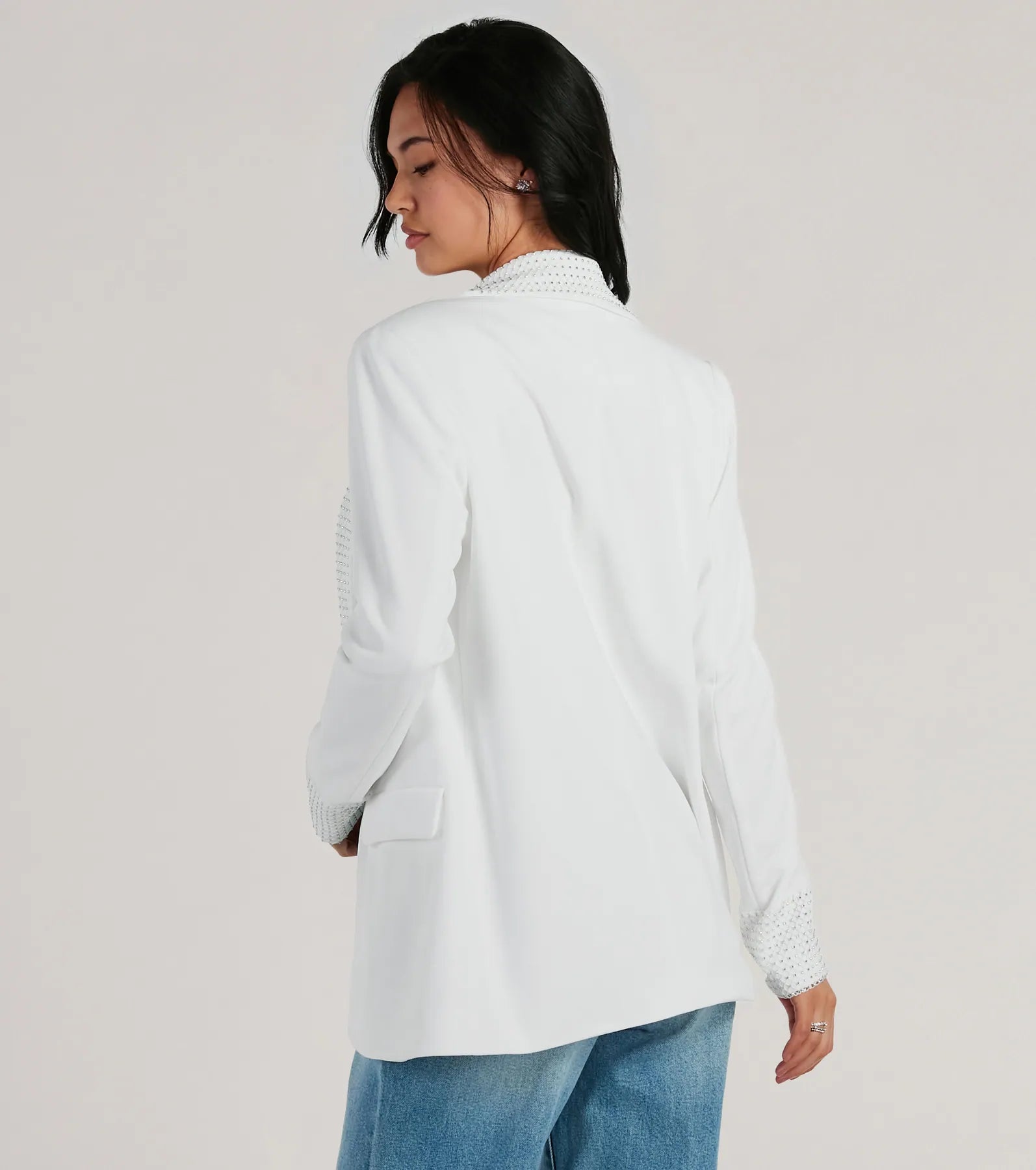 This crepe blazer takes business to a glamorous level! The long sleeves feature rhinestone fishnet cuffs and a collar for a chic touch that adds a hint of glamour. The dual button closures and faux pockets create a sleek silhouette, and the relaxed fit allows for comfortable and confident wear. Complete the look in a chic ring set.