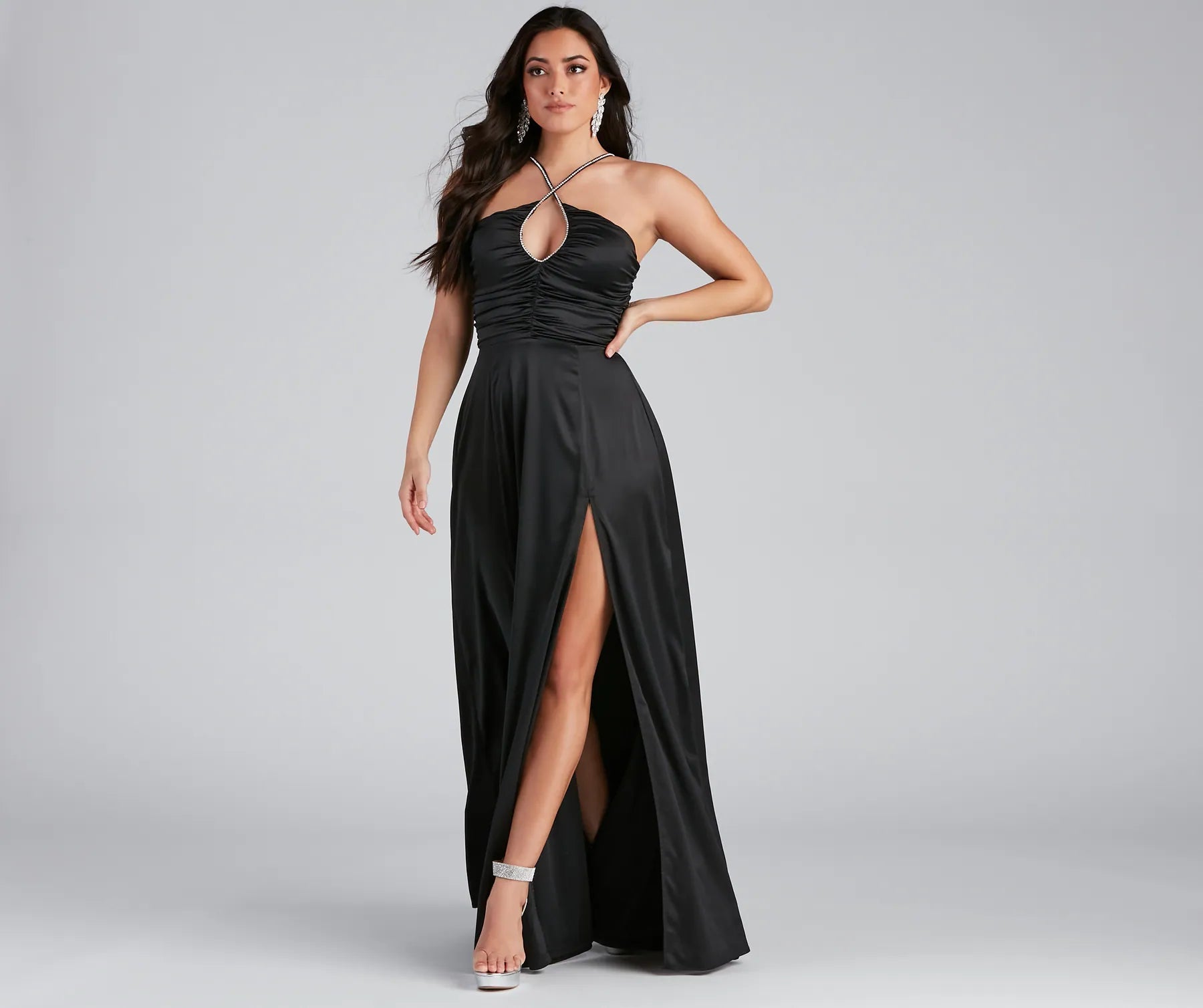 Bring the sparkle and shine with a dress that dares to bring the glamour! Kaelie features a halter neckline with rhinestone embellished straps that cross at the front and adjustable spaghetti straps that add a secure fit. The high waist leads to a flowy A-Line skirt that is accented with ruching and a high side slit. The dress is composed of a lined satin fabric that offers a flowy fit with minimal stretch. Complete look with rhinestone heels and a clutch.