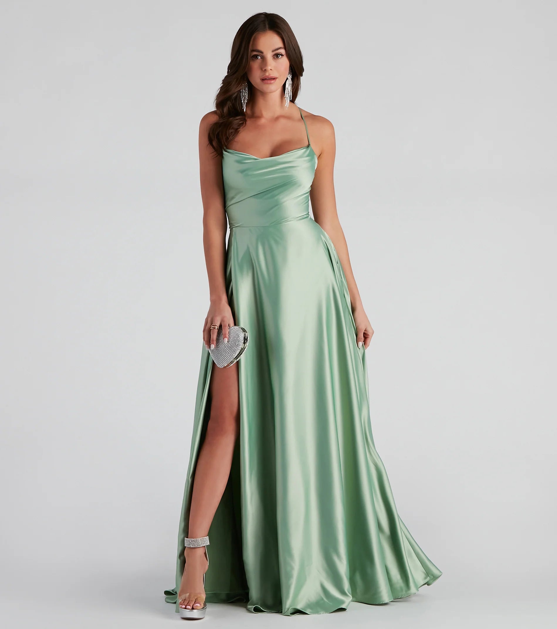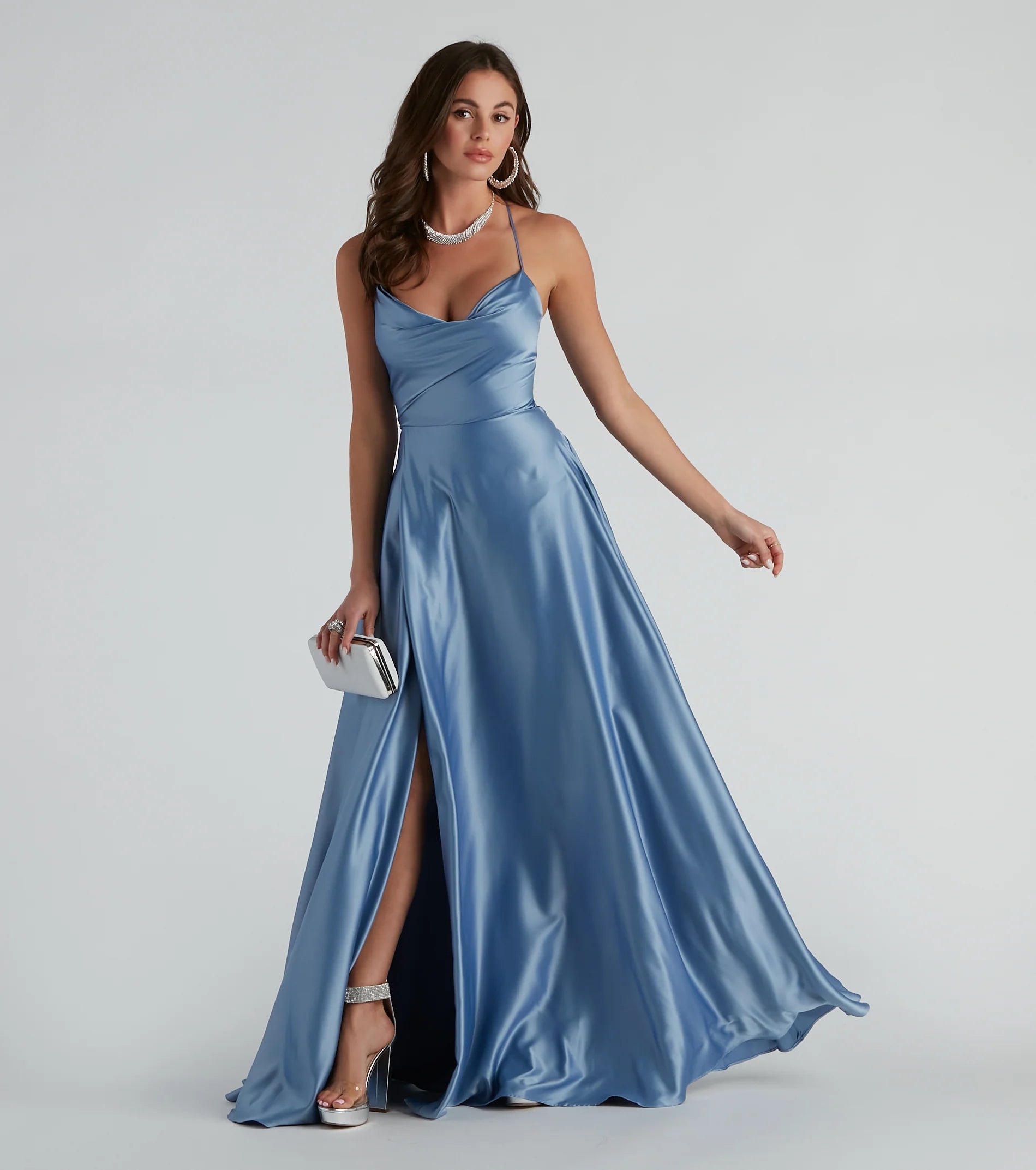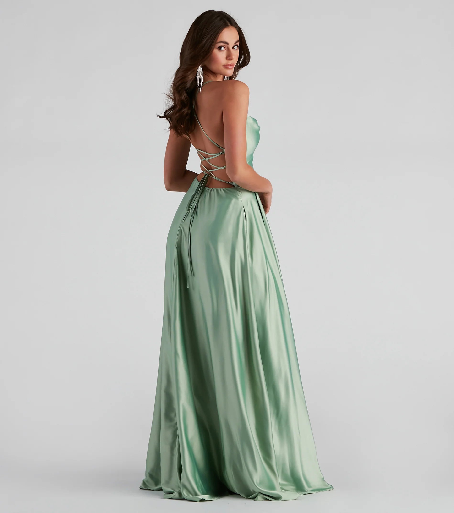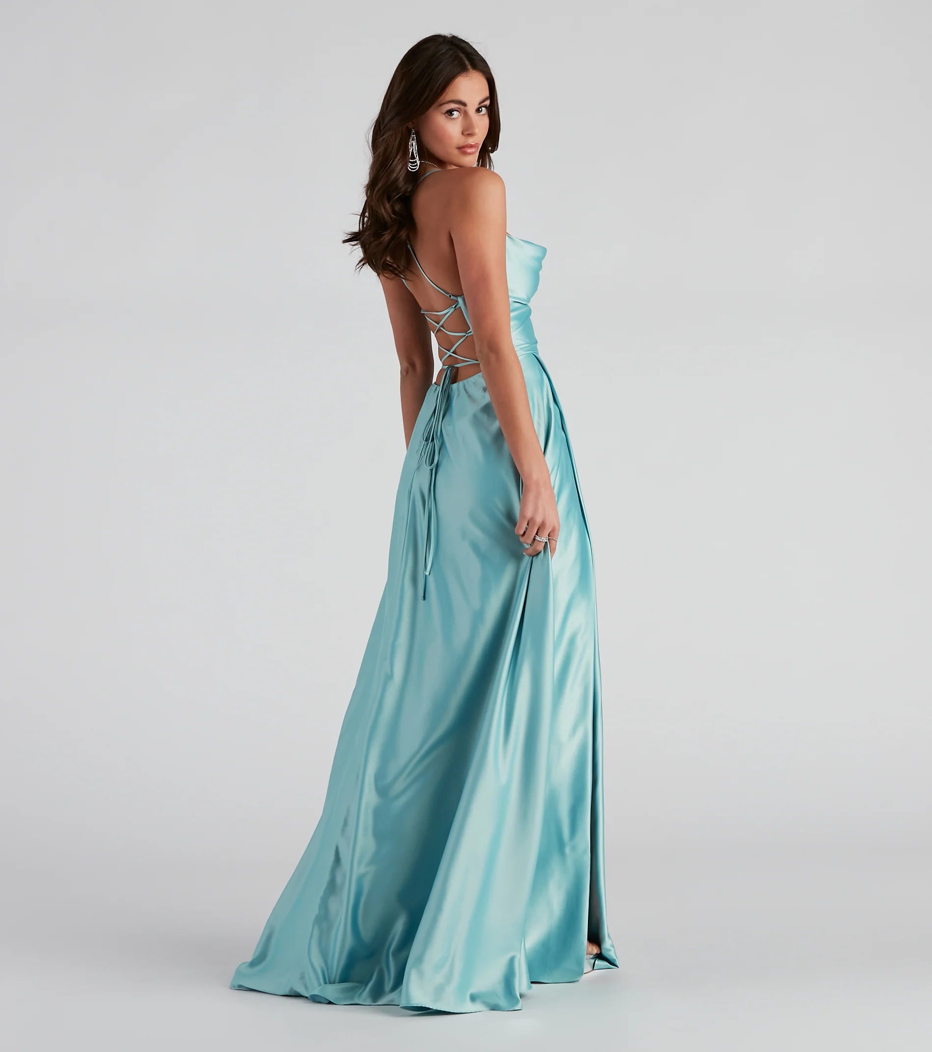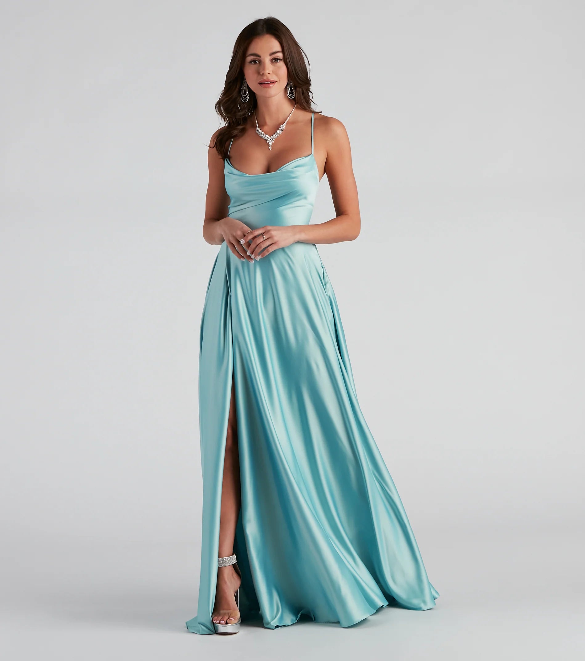 Lace-up in a glam formal dress that makes creates an enchanting entrance! Kailey features a sleeveless cowl neckline, adjustable spaghetti straps that lead to the lace-up back, and a flowy A-line silhouette accented with hidden side pockets. The dress is composed of lined satin fabric with minimal stretch. Complete look with rhinestone heels and an anklet.