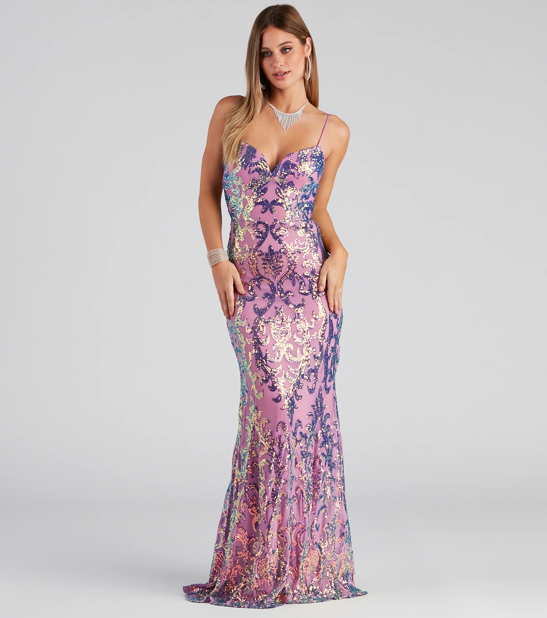 Look and feel like royalty in the Kazia formal sequin dress to create a memorizing entrance at prom! She features class and grace in a sleeveless, sweetheart neck with thin spaghetti straps and a built-in padded bust, and a low-cut back with tie closure. Her form-fitting bodice leads to a mermaid floor-length hem that showcases your flattering figure. The formal dress is composed of a sequin embroidered fabric with inner lining and no stretch. Complete the look in statement earrings.