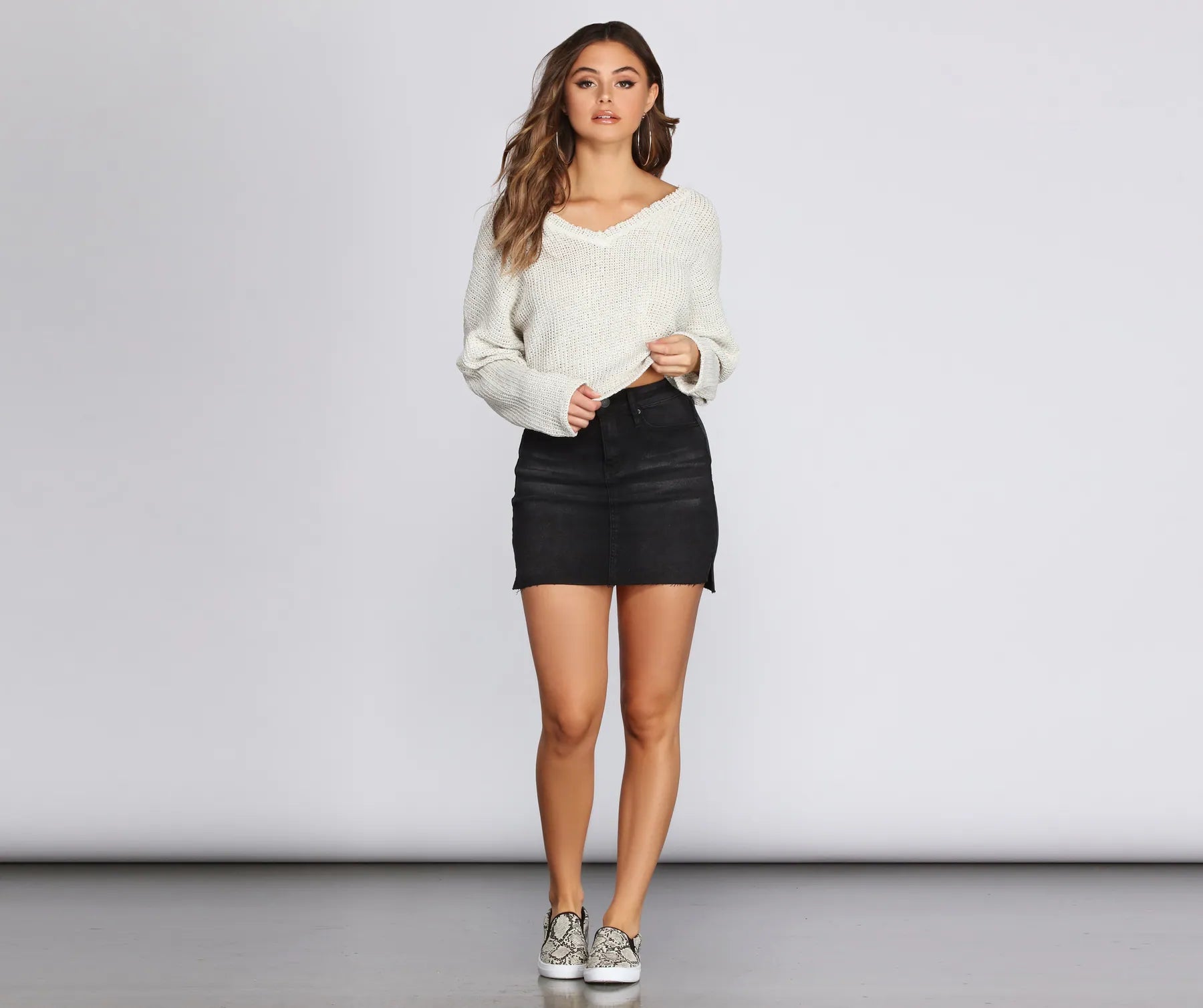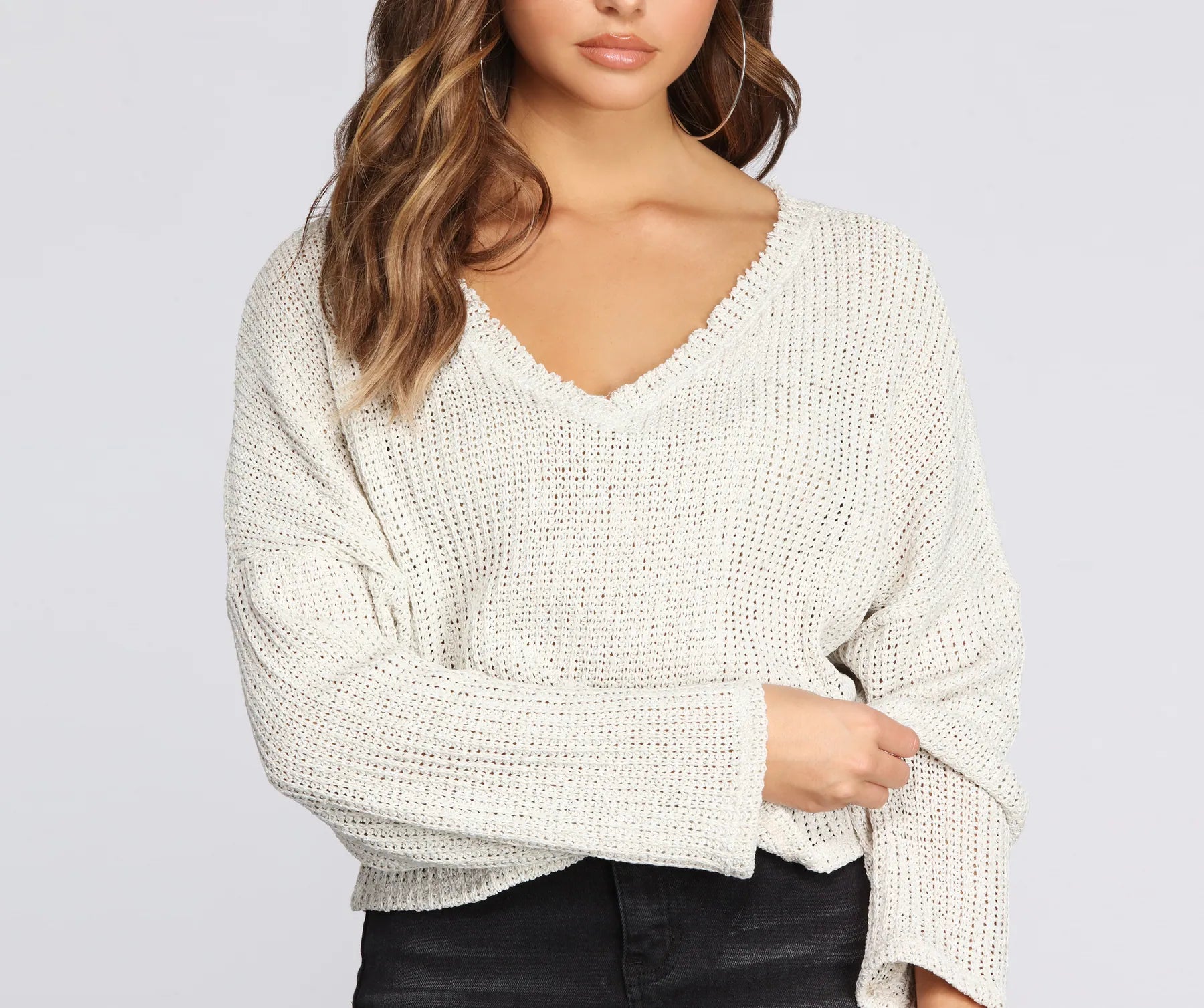 Perfect for those chilly warm-weather evenings—or when you're simply looking to chill—this streamlined open-weave sweater is a must. Pullover has a boxy, slightly cropped cut and features a V neck with raw-edge trim and long, batwing-style sleeves. Sweater is made from a soft, lightweight knit with a hint of stretch.