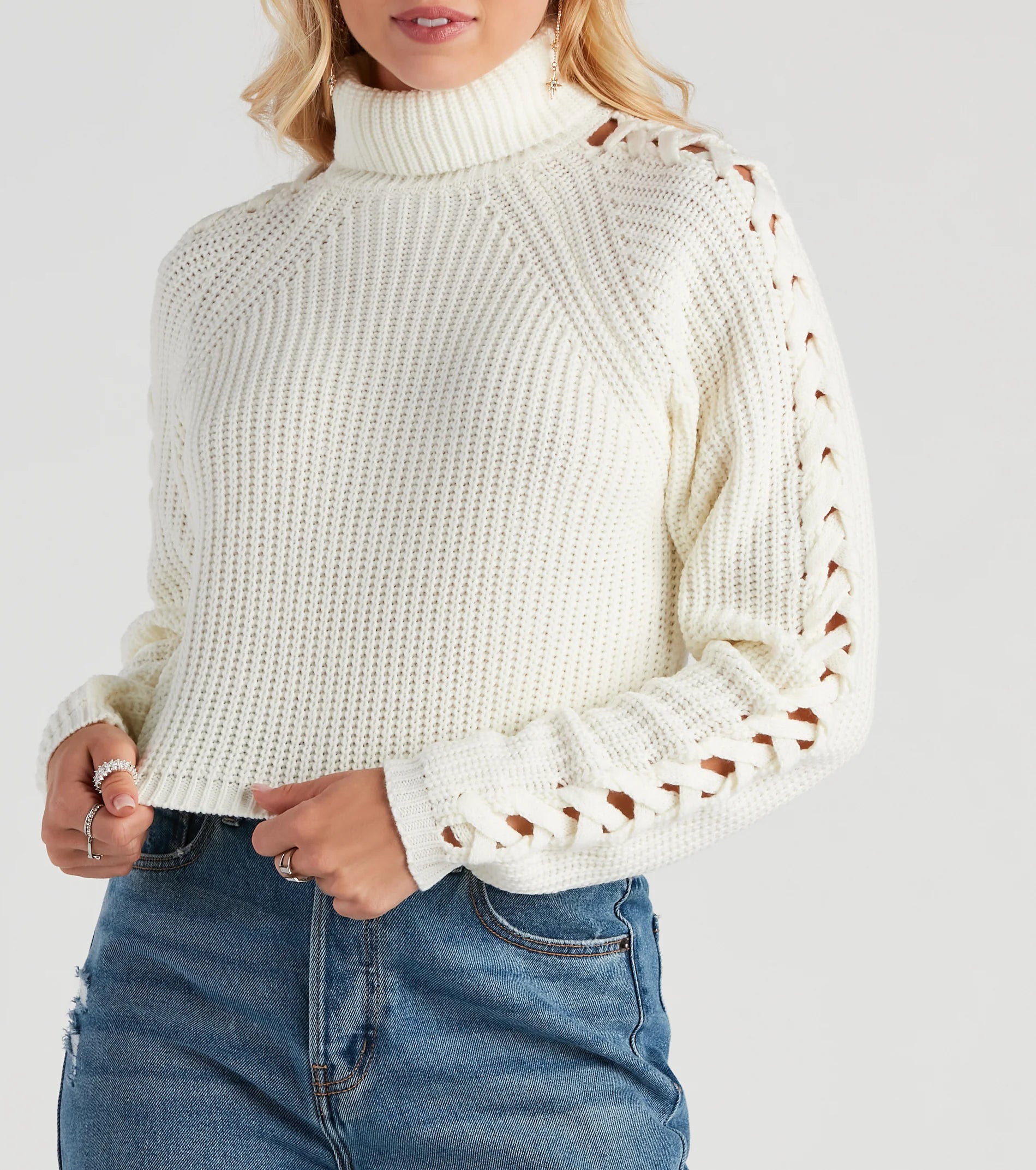 Keep cozy in this stylish turtleneck crop sweater featuring long sleeves with lace-up detail and a ribbed-knit design. Complete the look in high-rise jeans and booties this chilly season!