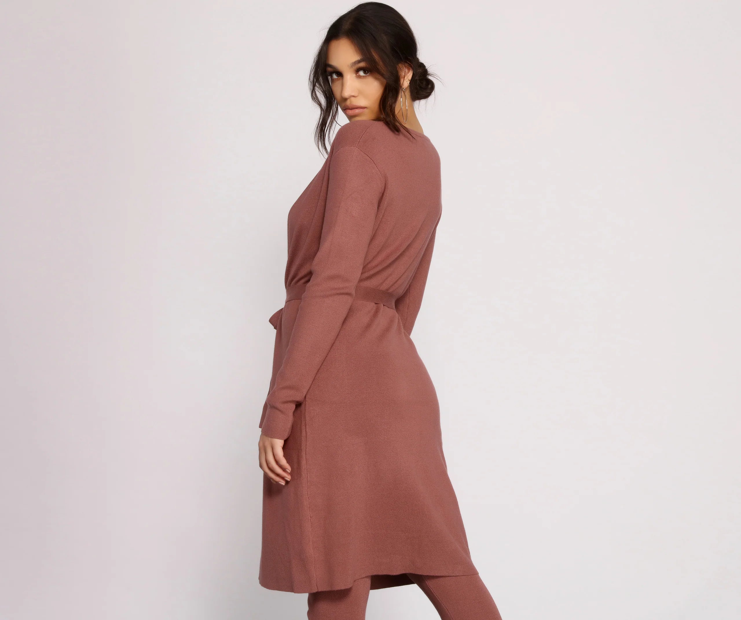 Keep it casual in a duster that is perfect for lounging in or making a quick coffee run. The duster features a draped open front, a cinching tie waist belt, long sleeves, and composed of a ribbed knit fabric. Complete look with the matching crop top and leggings.