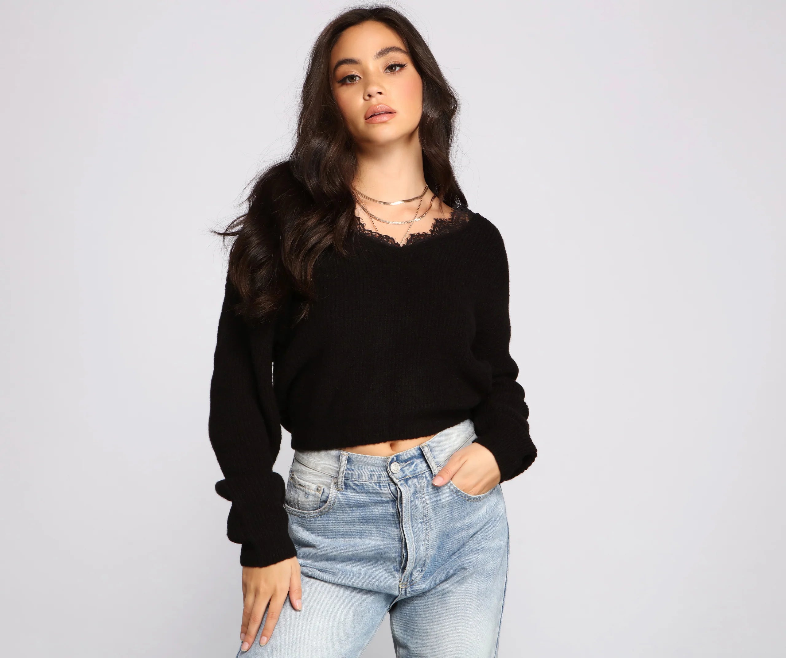Keep it chic in this glam sweater that brings stylish details to your look! The sweater features a v-neckline with lace trim, long sleeves, a bold open back design with a bar strap, and a cropped hem. The sweater offers a relaxed fit with a moderate stretch. Complete look with skinny jeans and booties.