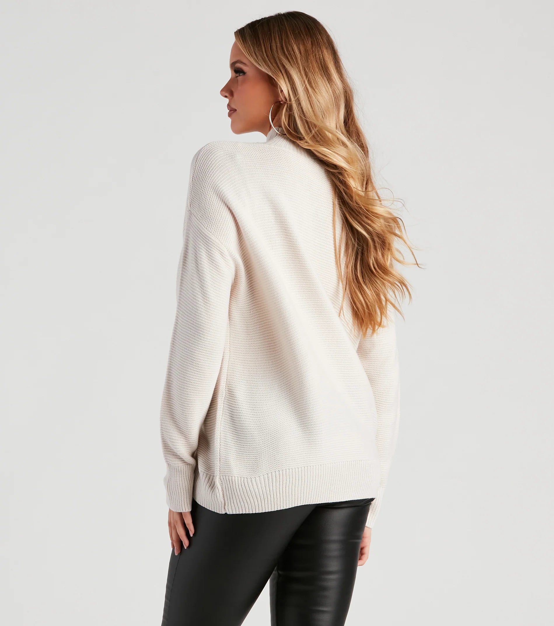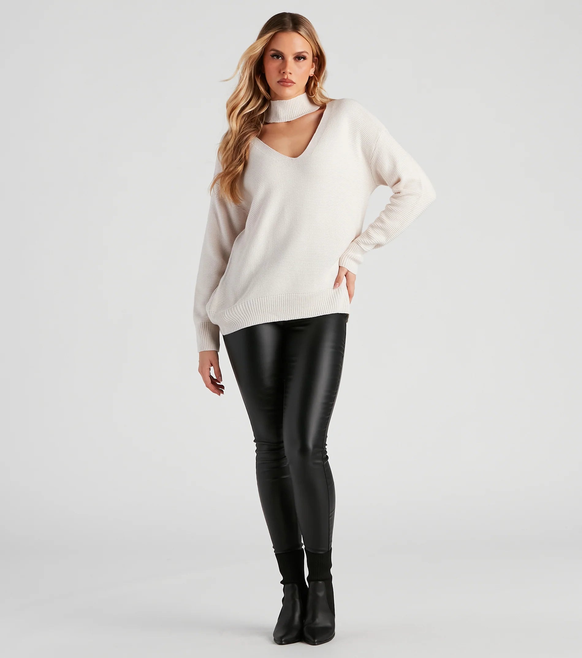 Keep your winter wardrobe chic with this trendy knit sweater! Featuring a mock neckline with a V-neck front cutout, long dolman-style sleeves, and a relaxed fit, this sweater can be effortlessly dressed up or down. The knit fabric offers minimal stretch. Pair with denim and sneakers for the day and sleek faux leather leggings and ankle booties for the night.