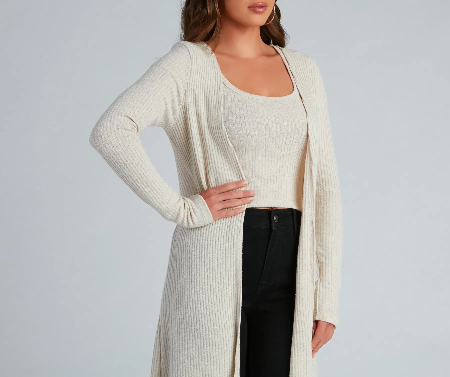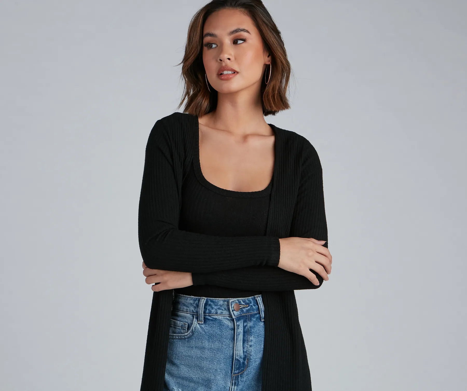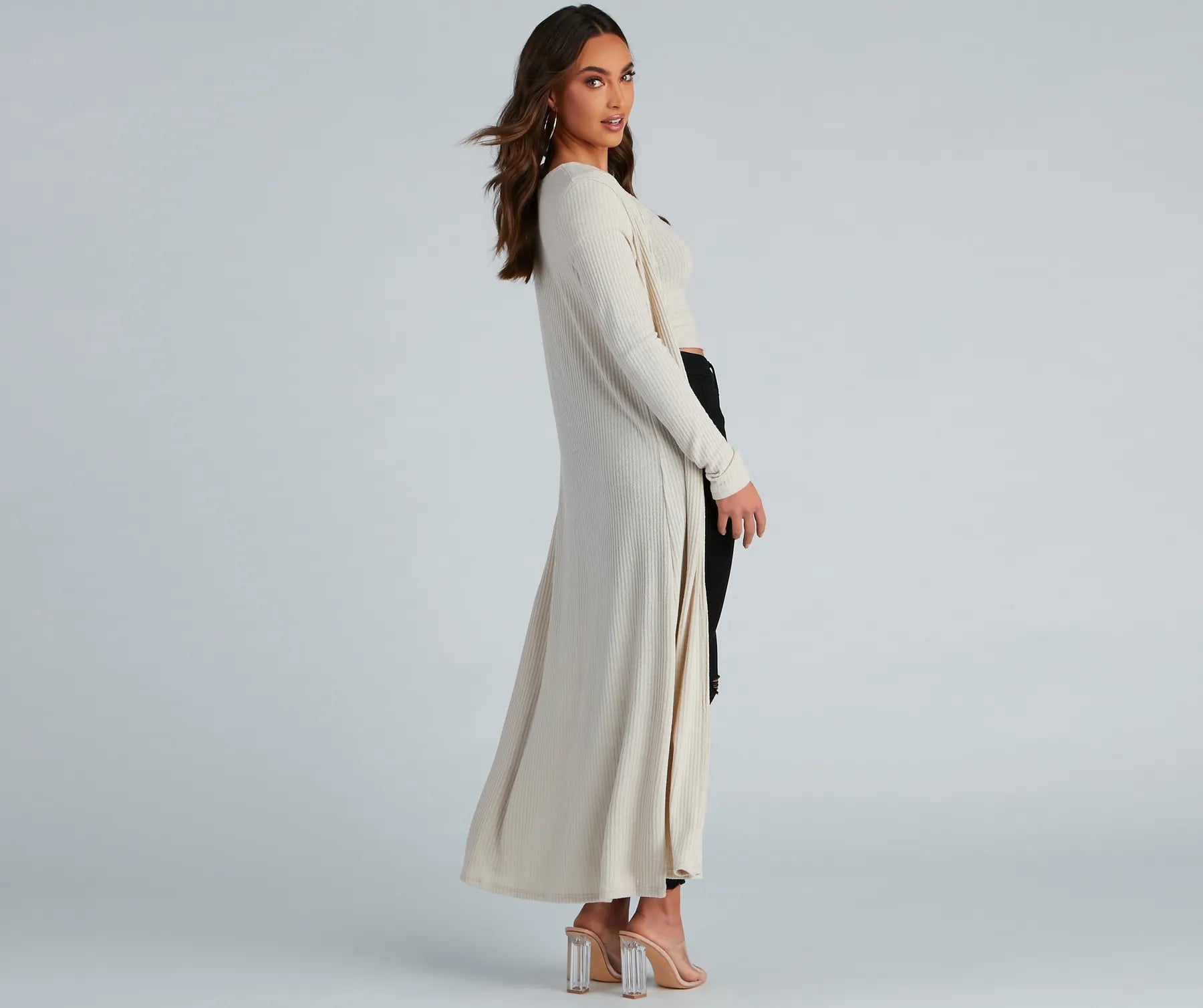 Lay on basics with this fab duster that can take you from lounging to coffee runs. The duster features a draped open front, long sleeves, and a flowy long length. The duster is composed of a ribbed knit fabric that offers a relaxed fit with a moderate stretch. Complete look with the matching crop top and chunky sneakers.