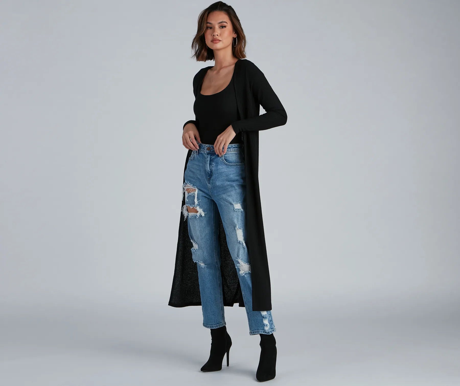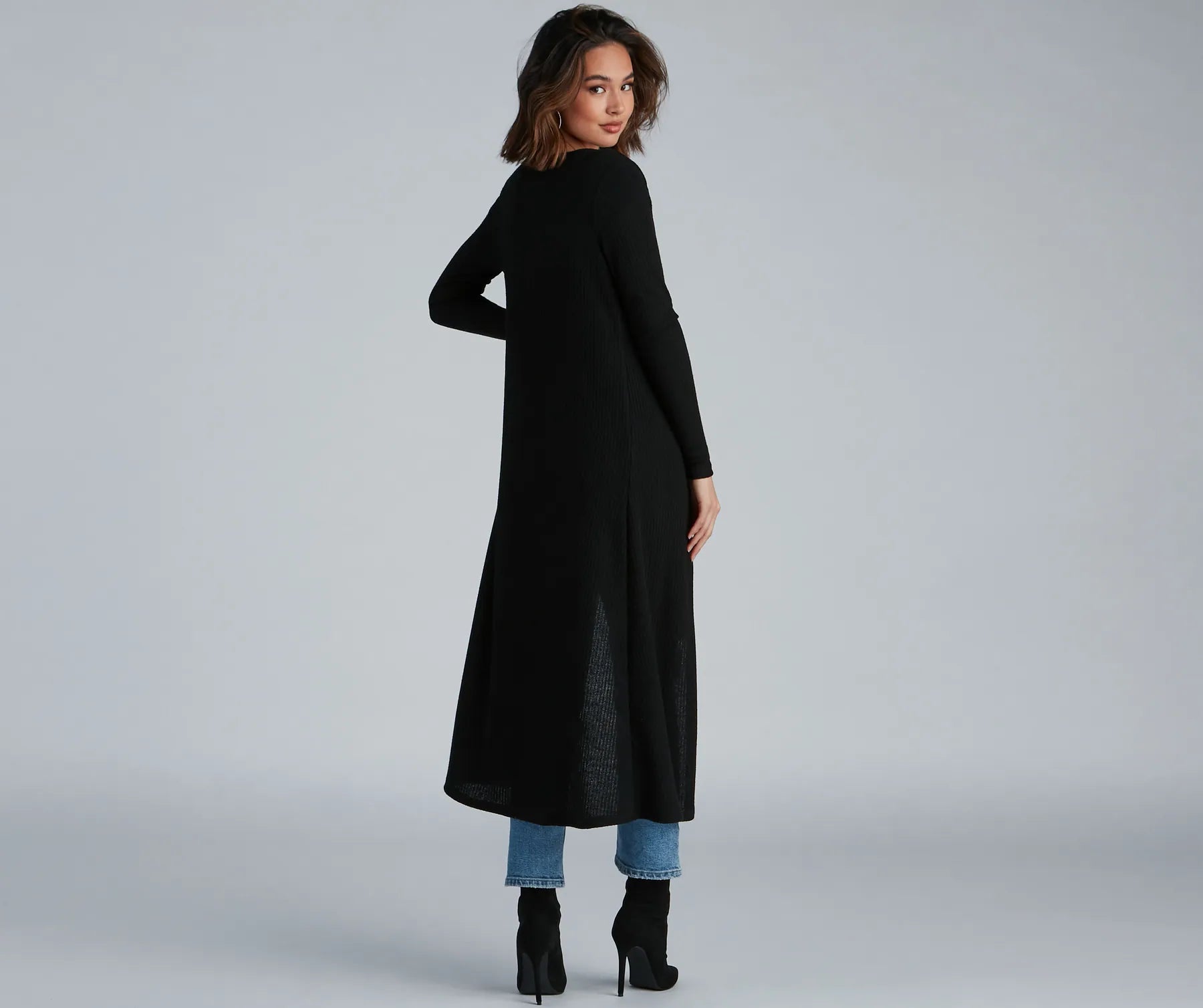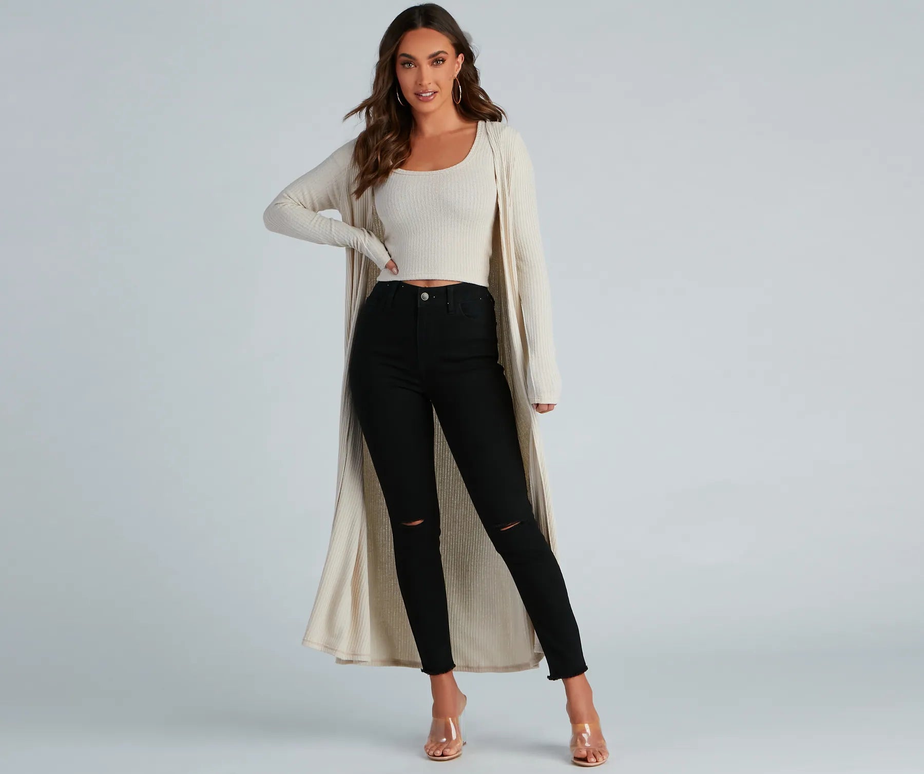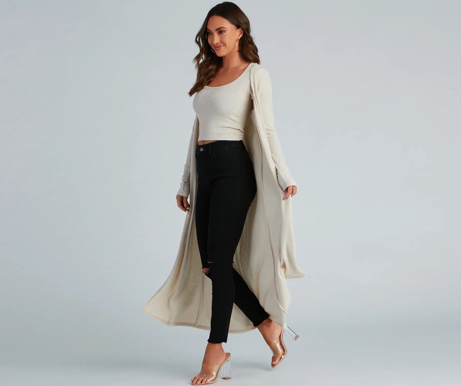 Lay on basics with this fab duster that can take you from lounging to coffee runs. The duster features a draped open front, long sleeves, and a flowy long length. The duster is composed of a ribbed knit fabric that offers a relaxed fit with a moderate stretch. Complete look with the matching crop top and chunky sneakers.