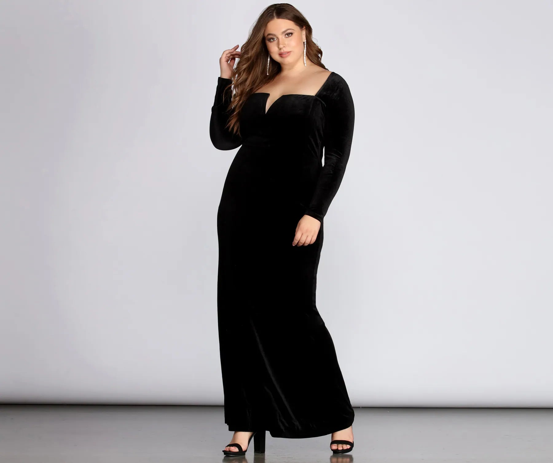 Make it a velvet affair in our luxe Kelly dress! She features a plunging wired V-neckline, long sleeves and a slim fit bodice that leads to a curve hugging floor length silhouette. Dress is composed of a lined velvet fabric that offers a moderate stretch for a comfortable wear. Includes a back zipper closure with hook and eye closure.