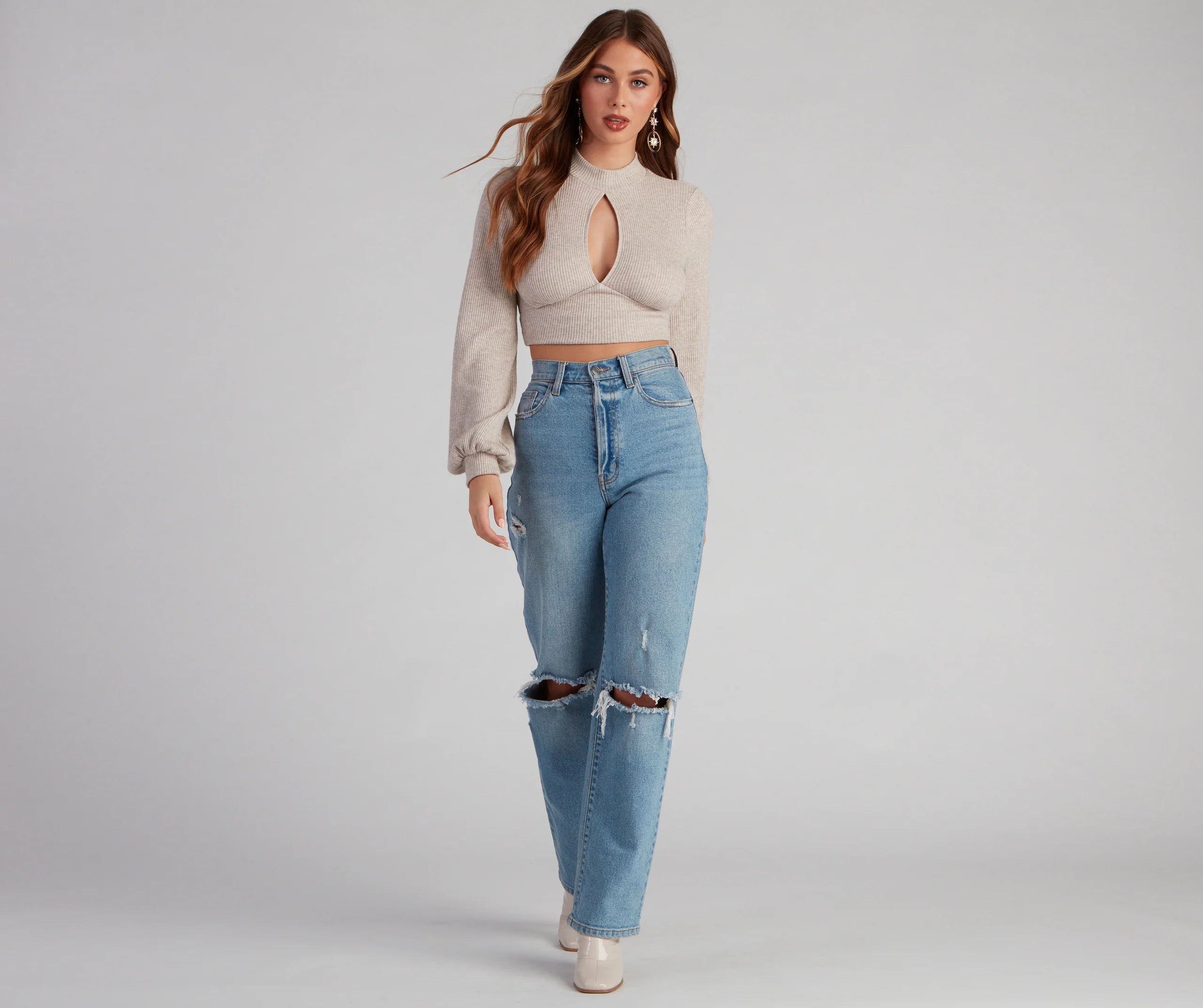 Look and feel so cute in this long sleeve crop top! It features a mock neck with a front keyhole, tie-back waist on an open back composed of a waffle knit fabric with a moderate stretch. Complete your look in boyfriend jeans and classic hoops.