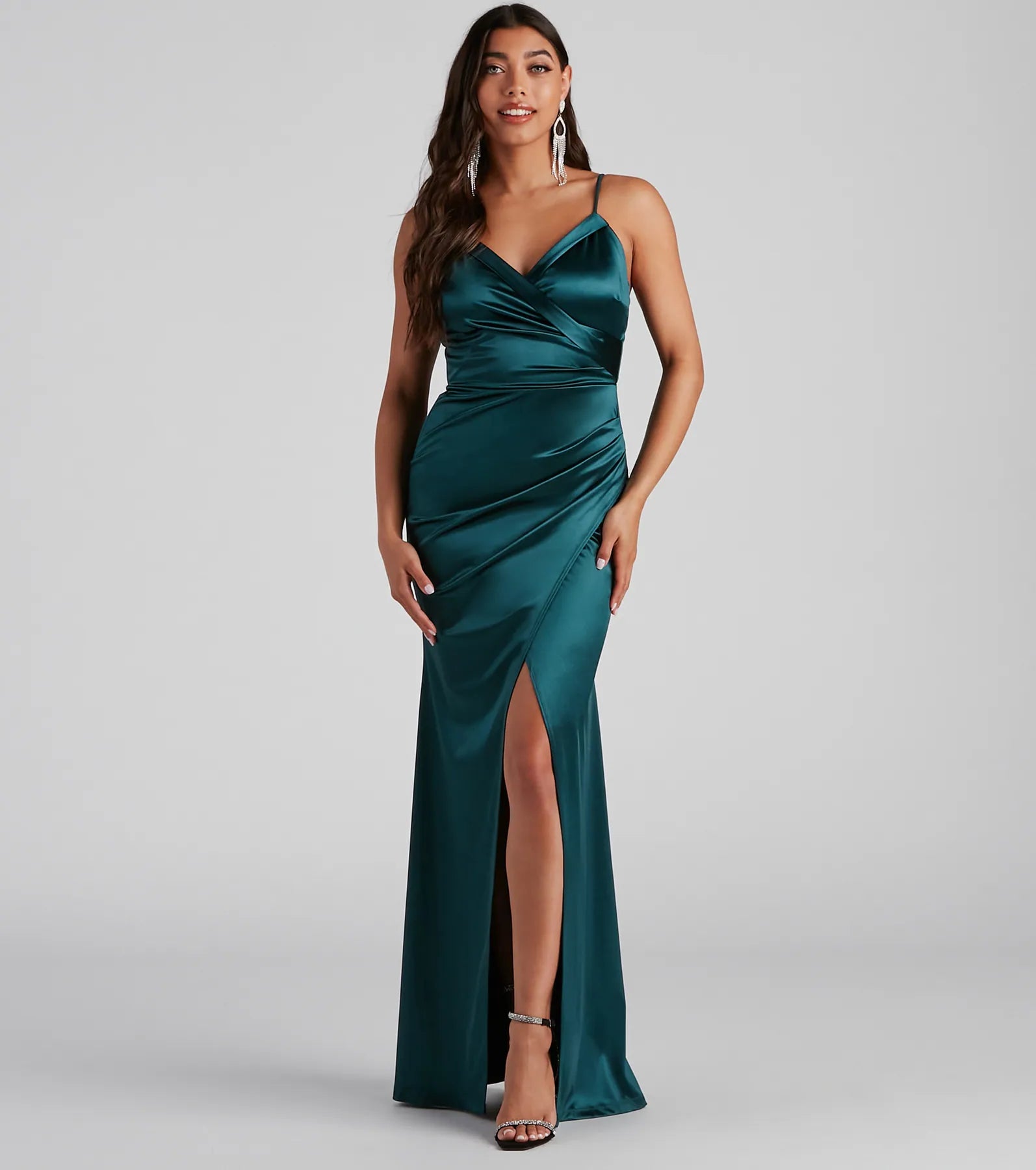 Wrap yourself in elegance tonight when you slip into a luxe gown! She is designed with a v neckline, adjustable spaghetti straps, padded cups, and a fold-over trim. Her bodice leads to a high waistline that gathers at one side and the start of a long skirt that wraps over. Her skirt leads to a floor-sweeping length and features a high slit at the center. She is lined at the bust and has a zipper closure at the back with a hook and eye closure that keeps her in place all night! Complete your formal outfit with a satin clutch.
