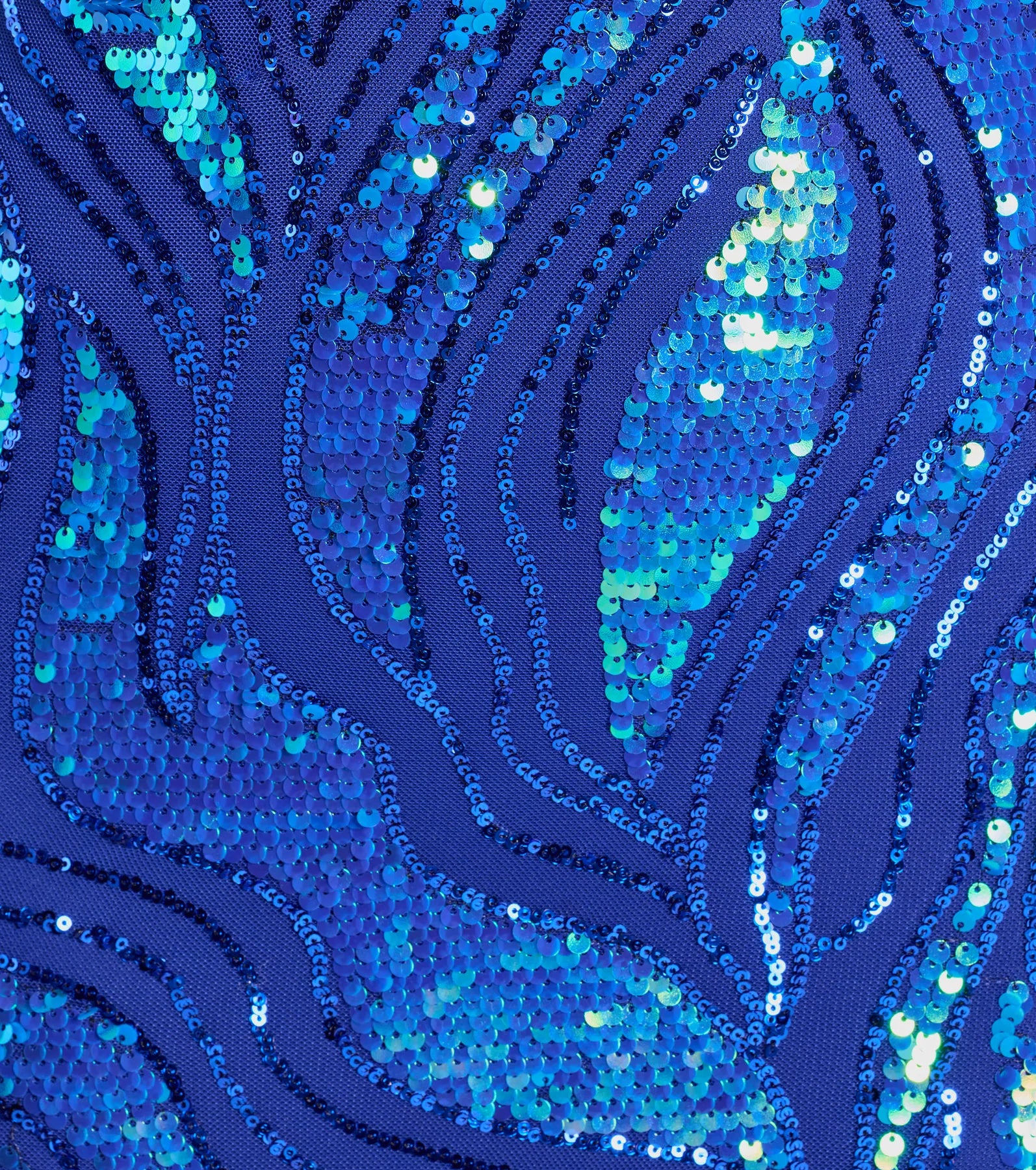 Illuminate the night in the Kitana sequin formal dress crafted with lined mesh fabric embroidered with iridescent sequins in a stunning abstract swirl pattern. It features a sleeveless V-neckline with a padded bust for support, spaghetti straps leading to a bold open back with a cross-back lace-up strappy design, and a short bodycon silhouette.